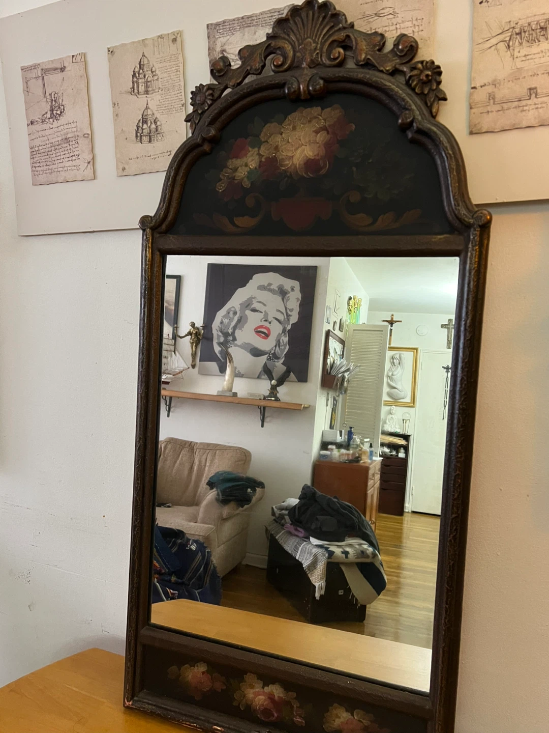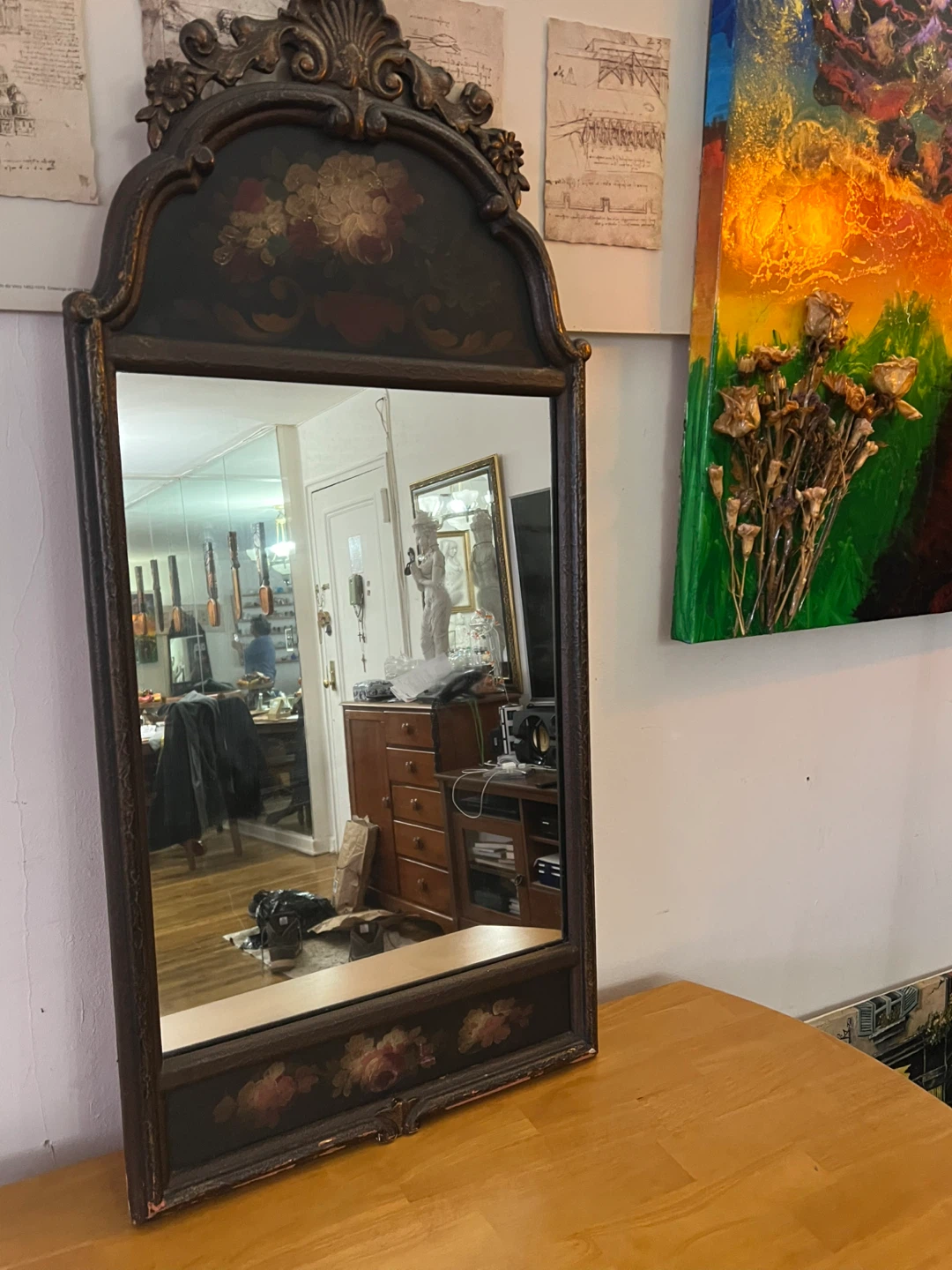 This ornate mirror features a decorative wooden frame with a painted floral design. The frame itself has a distressed finish, adding to its antique charm. It's a beautiful statement piece for any room!