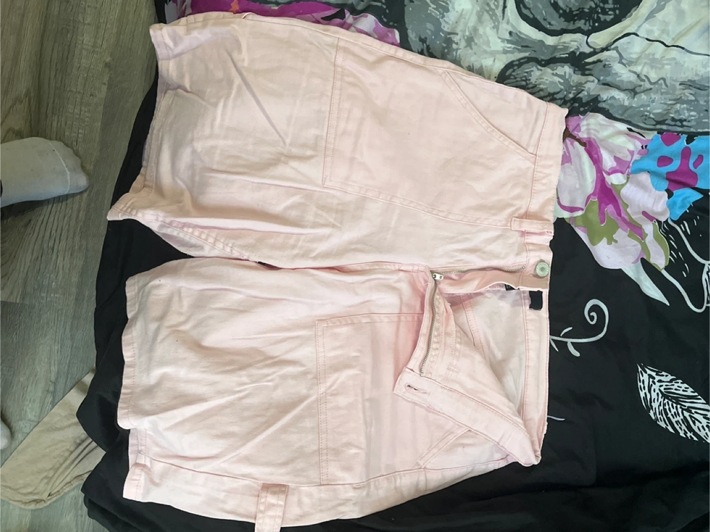 Light pink denim shorts with a zipper and button closure. It has front pockets and belt loops. Material is cotton blend.