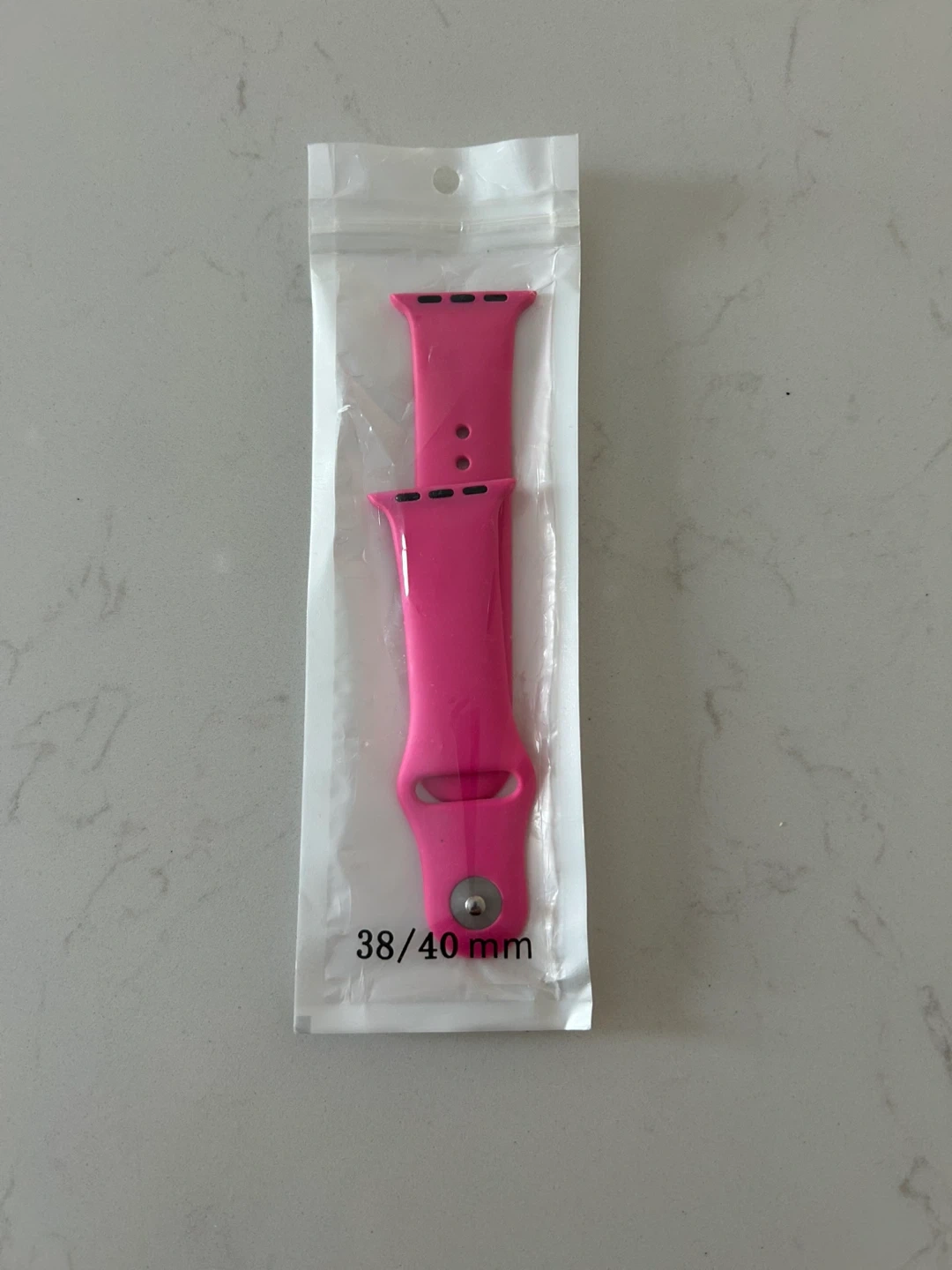 This is a bright pink silicone watch band compatible with 38mm and 40mm Apple Watches. It's made from durable silicone material for everyday wear. It's a great replacement band for your Apple Watch!