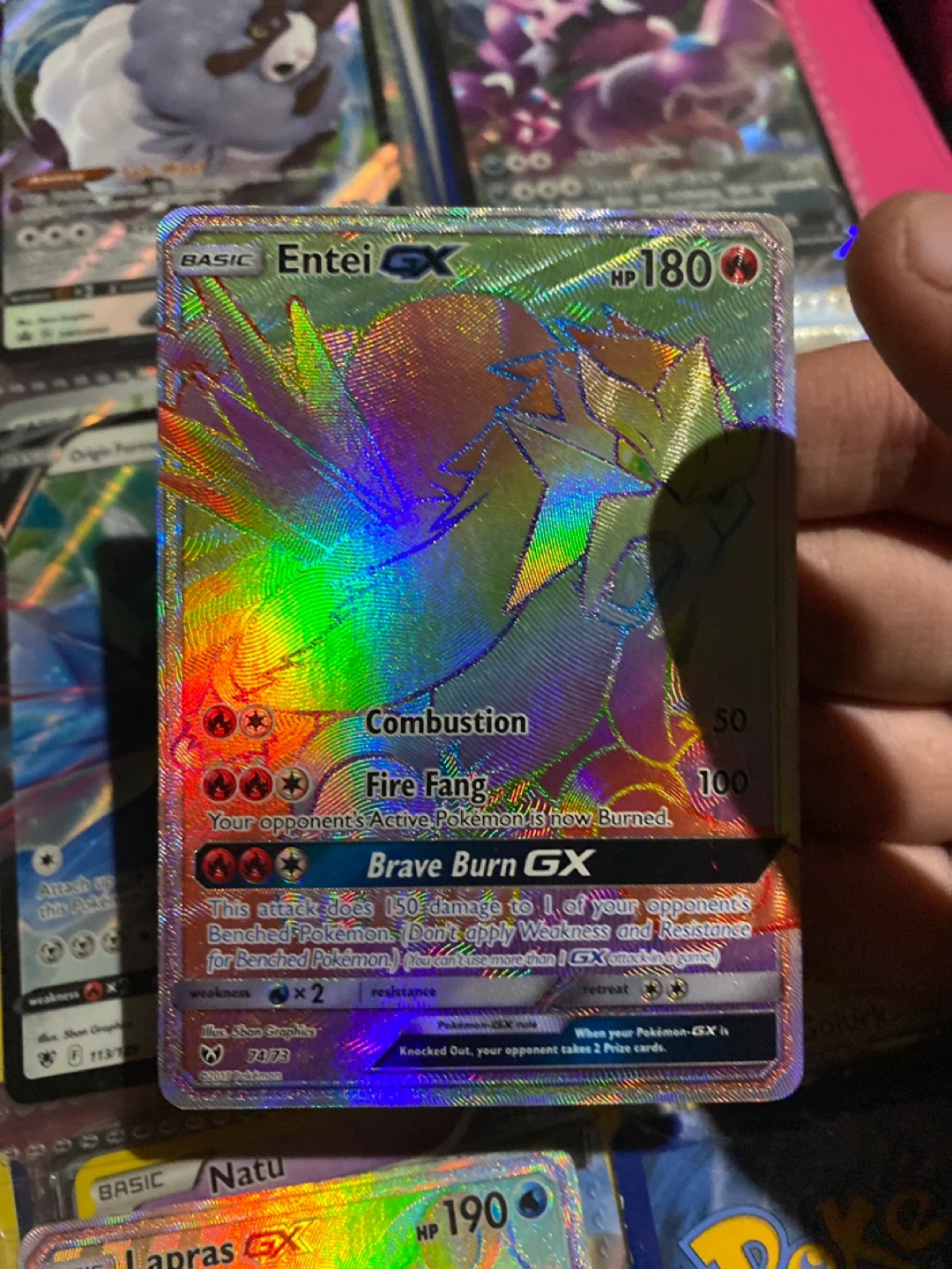 Selling an Entei GX Pokemon card. It has a rainbow holographic finish and looks to be in great condition. A great addition to any collection!