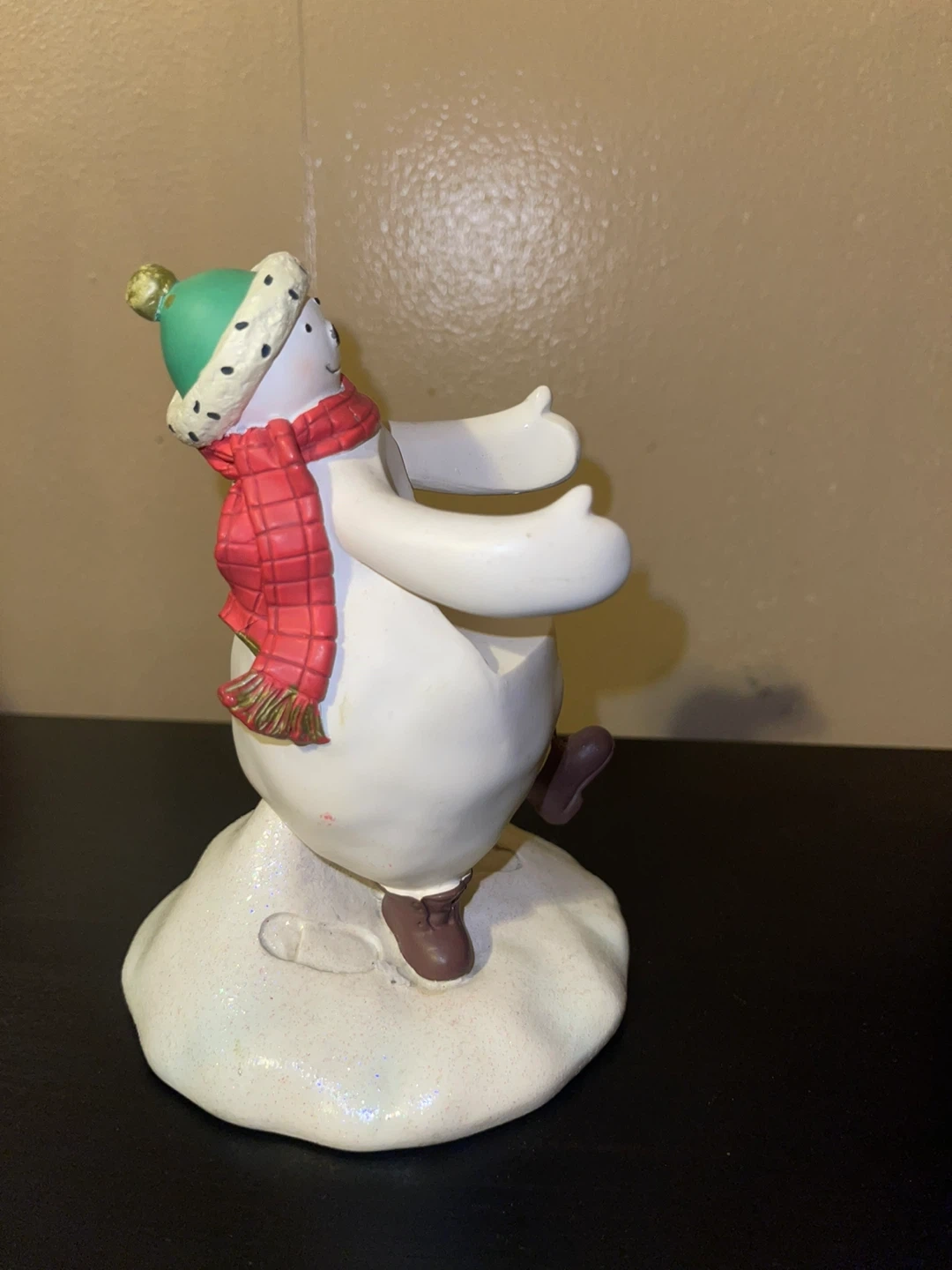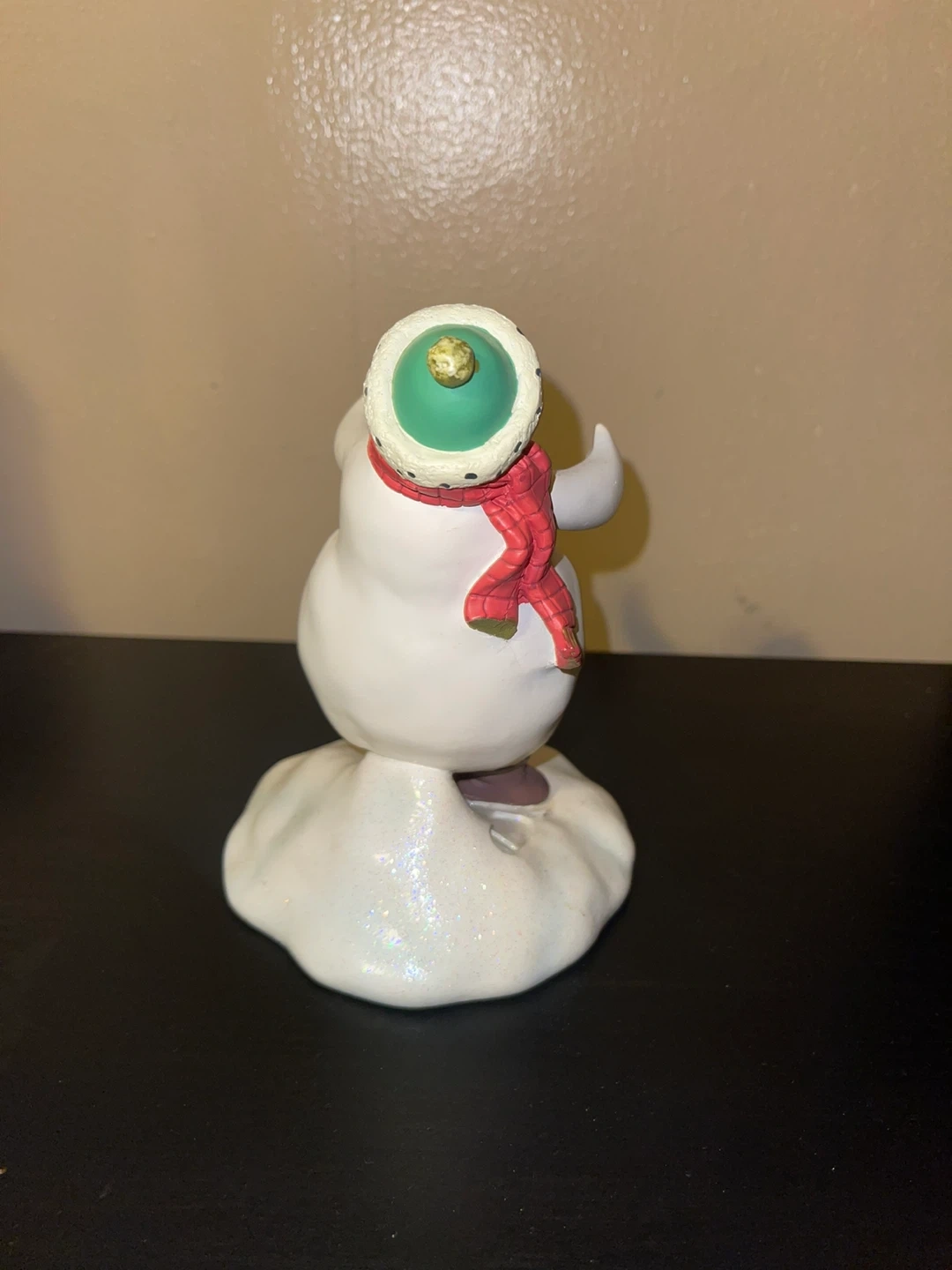 This decorative snowman figurine features a red scarf and a green hat. It's made of painted ceramic material. It sits on a sparkly white base. Perfect for adding a festive touch to your holiday decor!