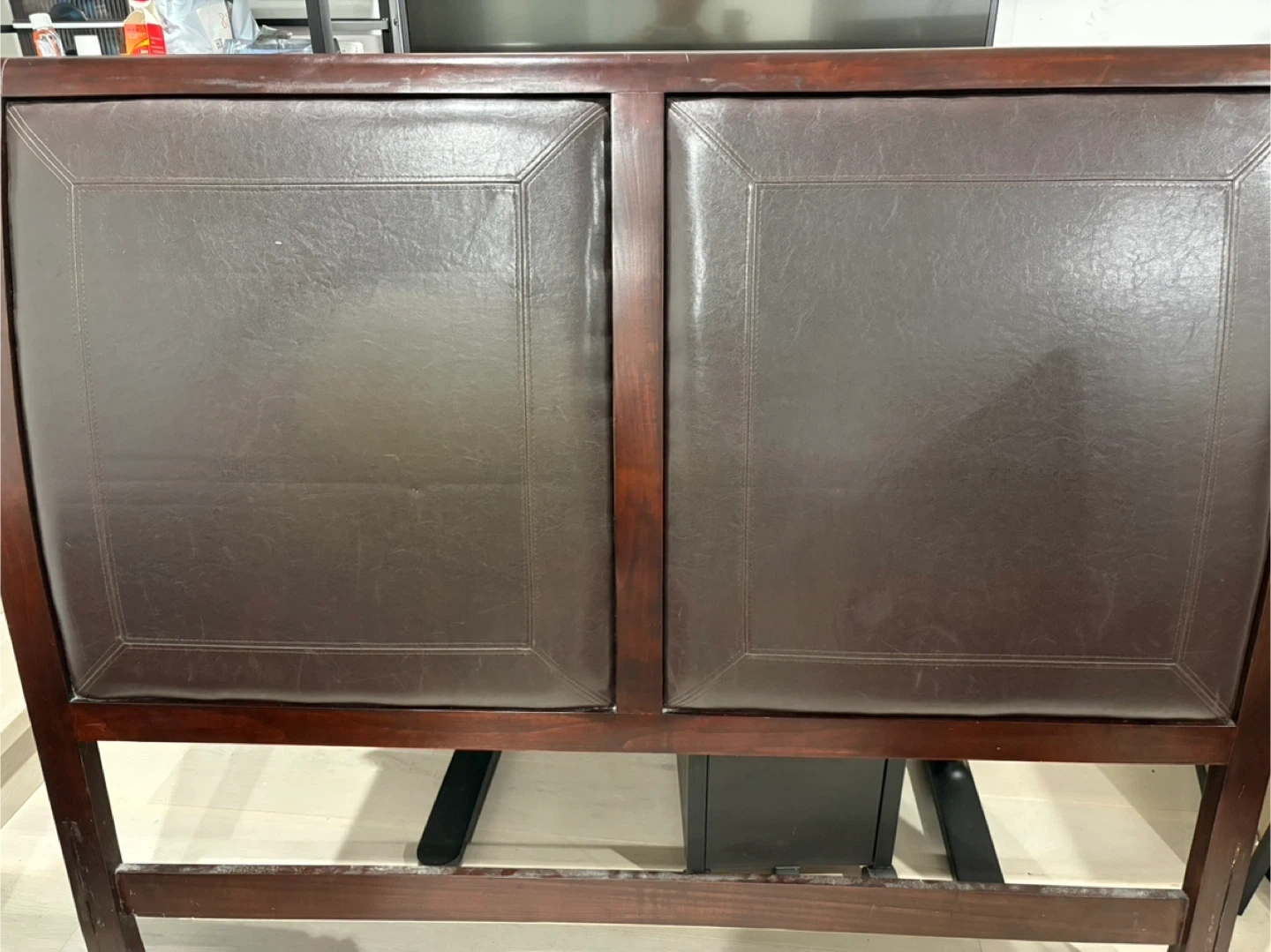 Selling a wooden headboard with brown leather padding. Queen size leather bed frame from Brick. It's in good condition. Please message me if you're interested!