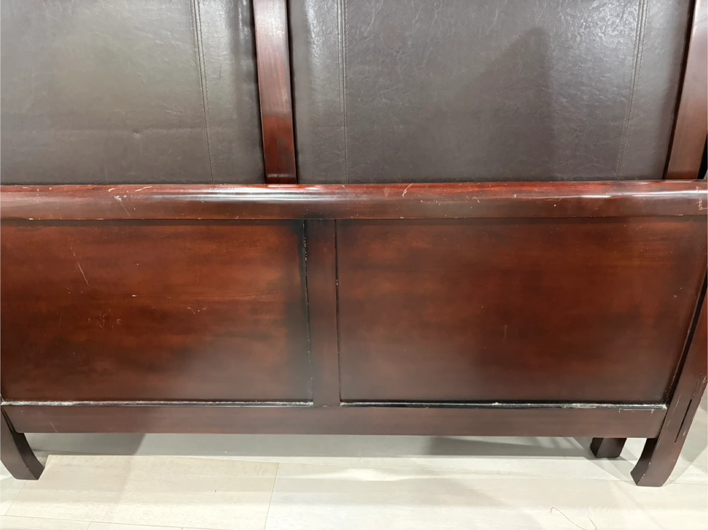 Selling a wooden headboard with brown leather padding. Queen size leather bed frame from Brick. It's in good condition. Please message me if you're interested!