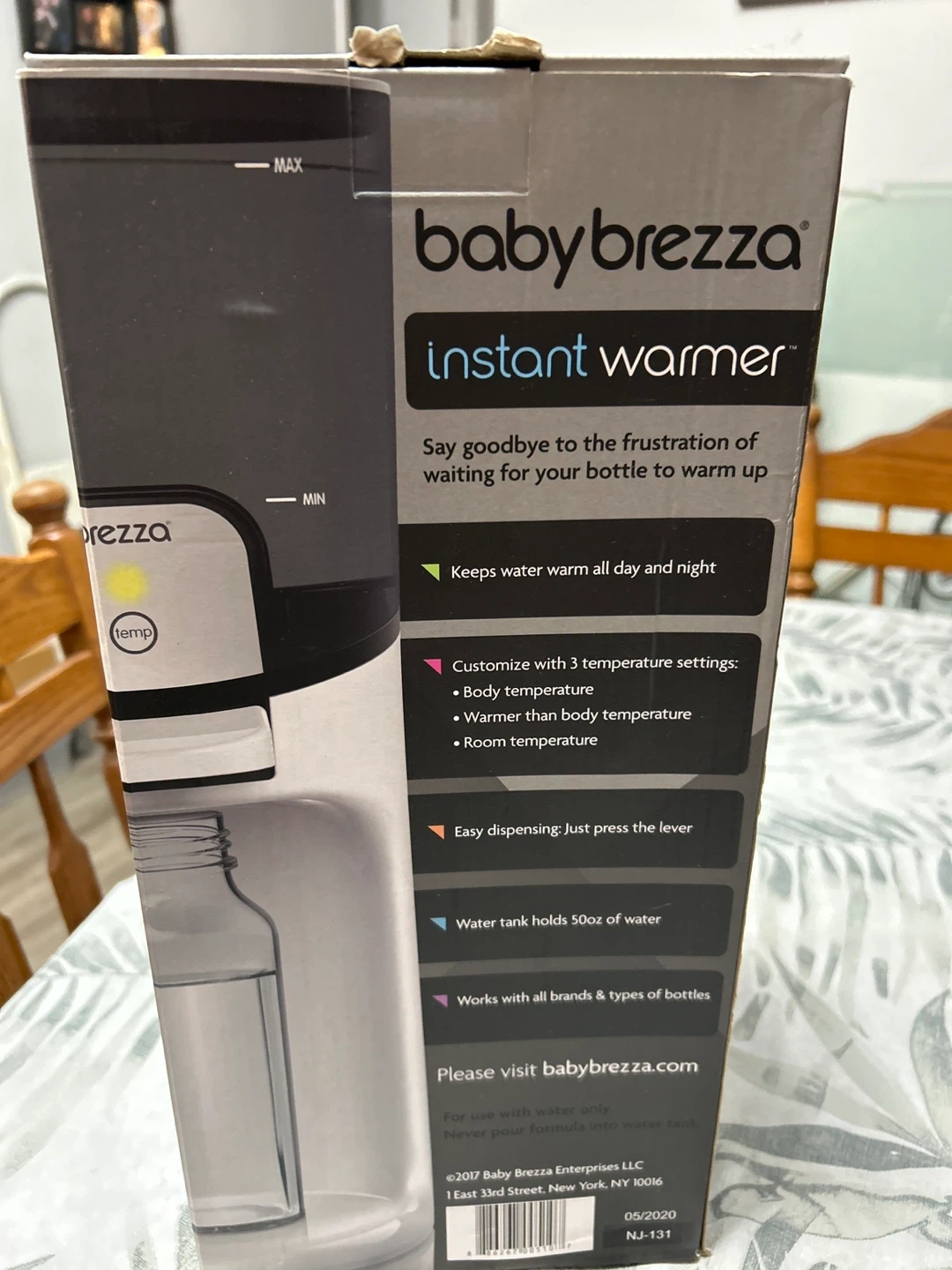 This Baby Brezza Instant Warmer quickly warms formula bottles. It dispenses warm water on-demand with 3 temperature settings. The water tank holds 50 oz and it's BPA-free.