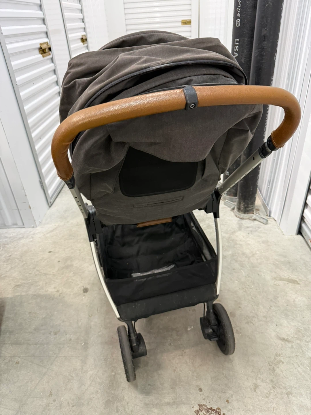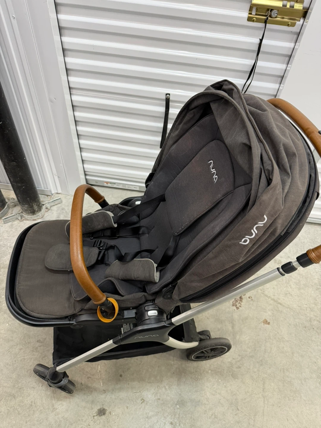 This is a Nuna stroller in a dark gray color. It has a faux leather handle and a padded seat with a 5-point harness. It's suitable for travel.