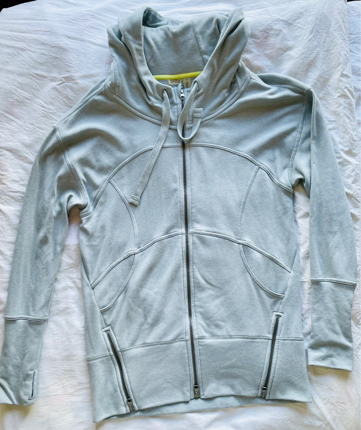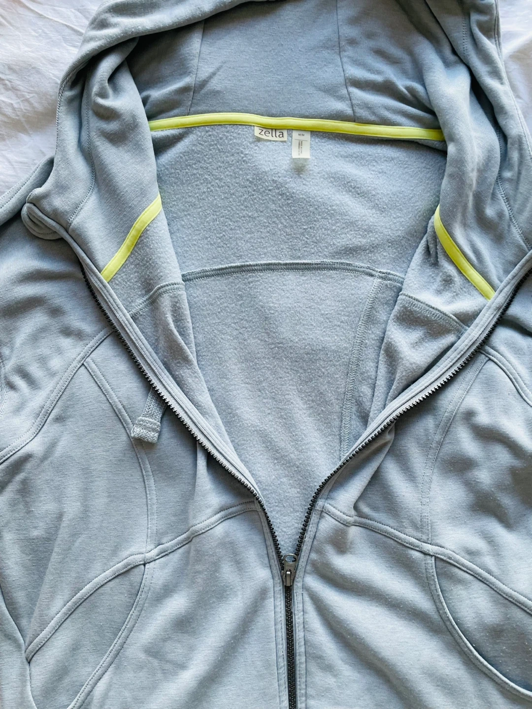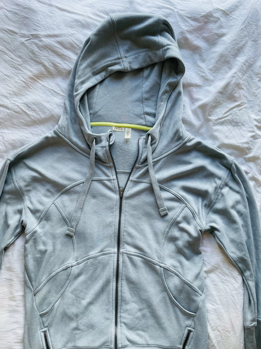 This Zella full zip hoodie is a light blue-grey colour. It's a comfortable athletic jacket with a hood. Two zip pockets are found at the hips.