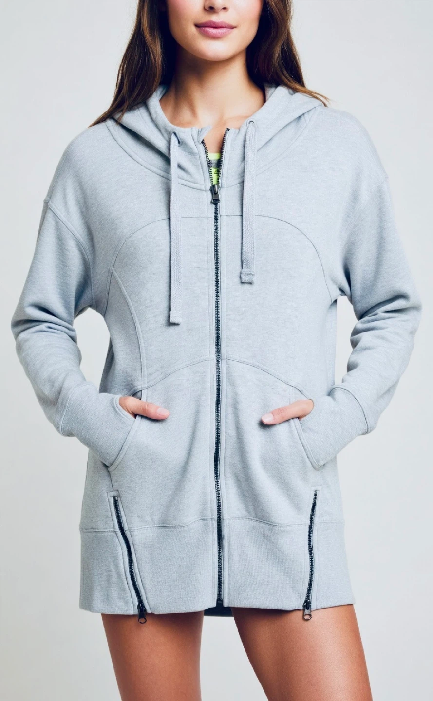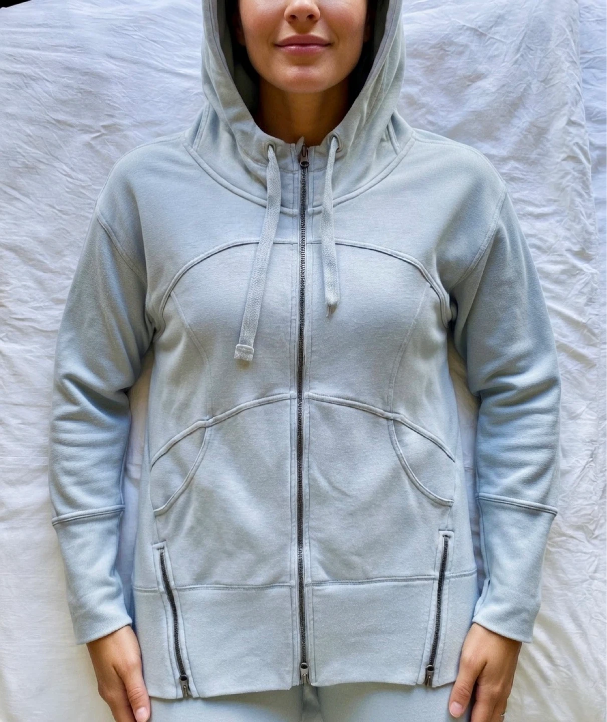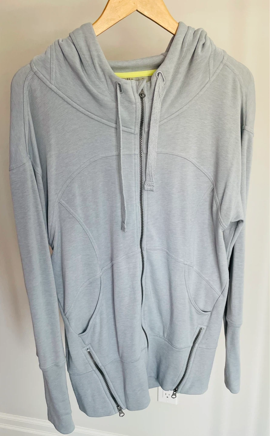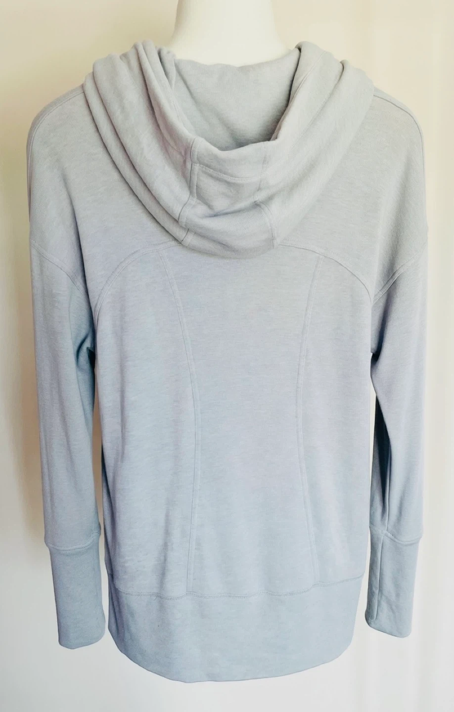This Zella full zip hoodie is a light blue-grey colour. It's a comfortable athletic jacket with a hood. Two zip pockets are found at the hips.