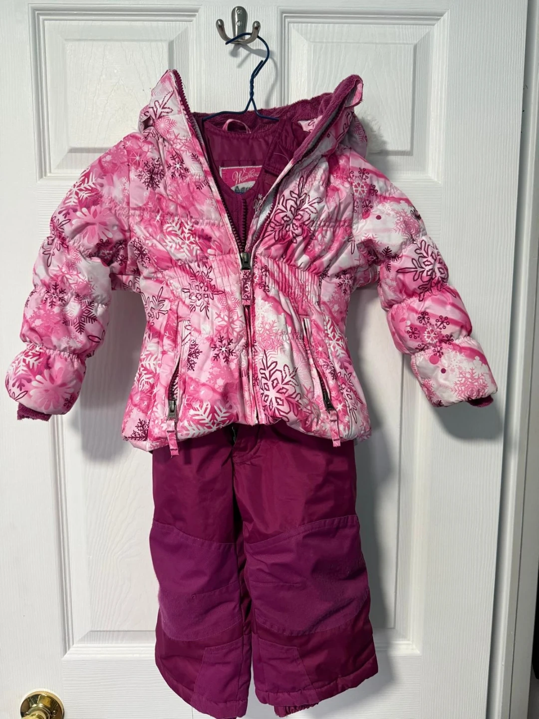 Selling a bundle of kids winter outerwear! Includes a maroon puffer jacket, a blue dinosaur snowsuit, and a pink floral snowsuit set. All in great condition and ready for winter adventures