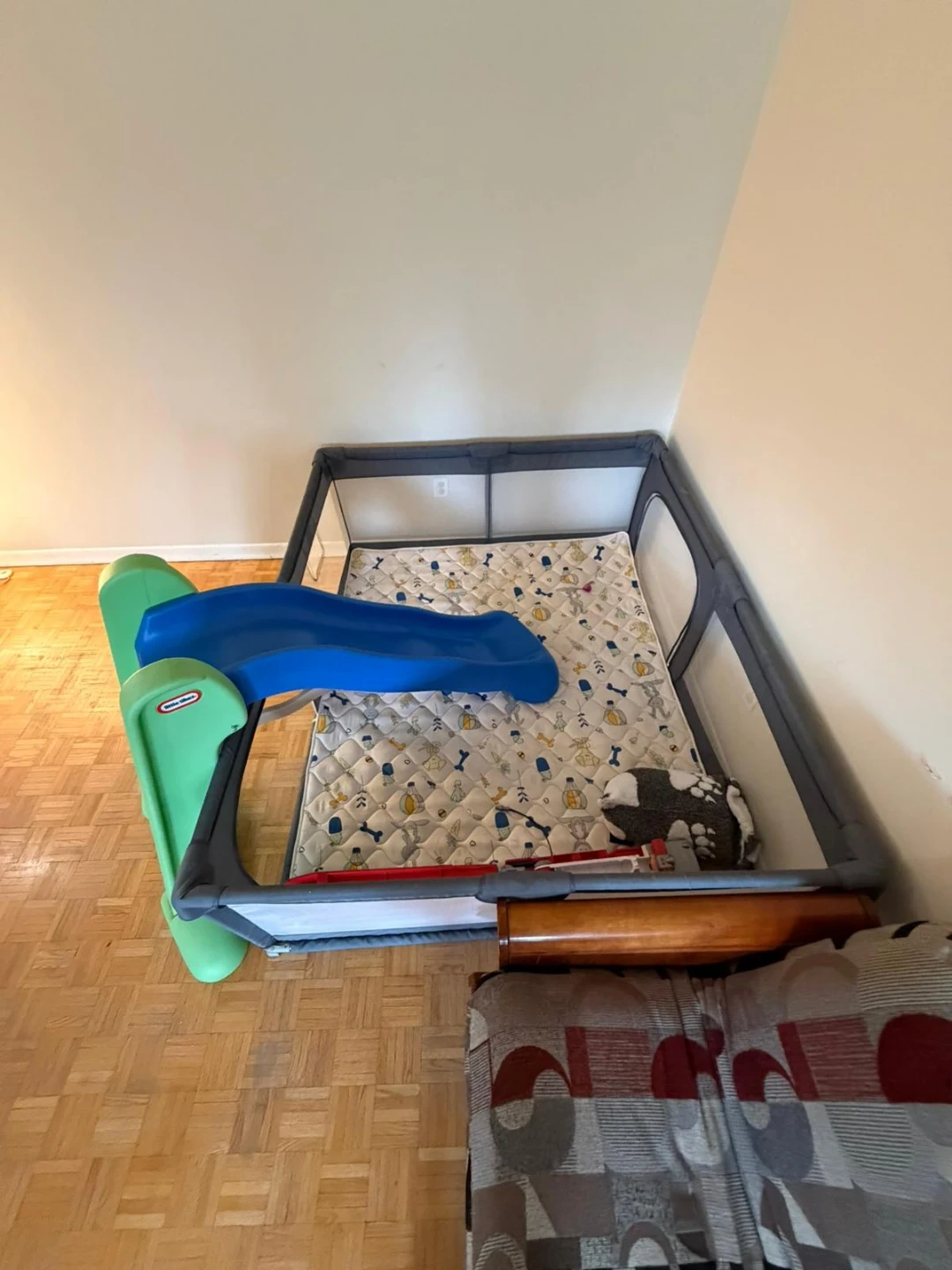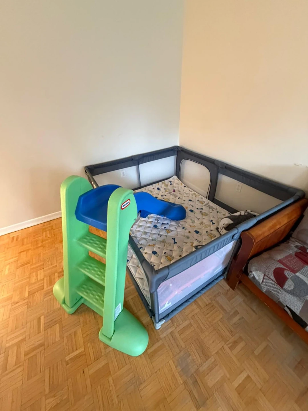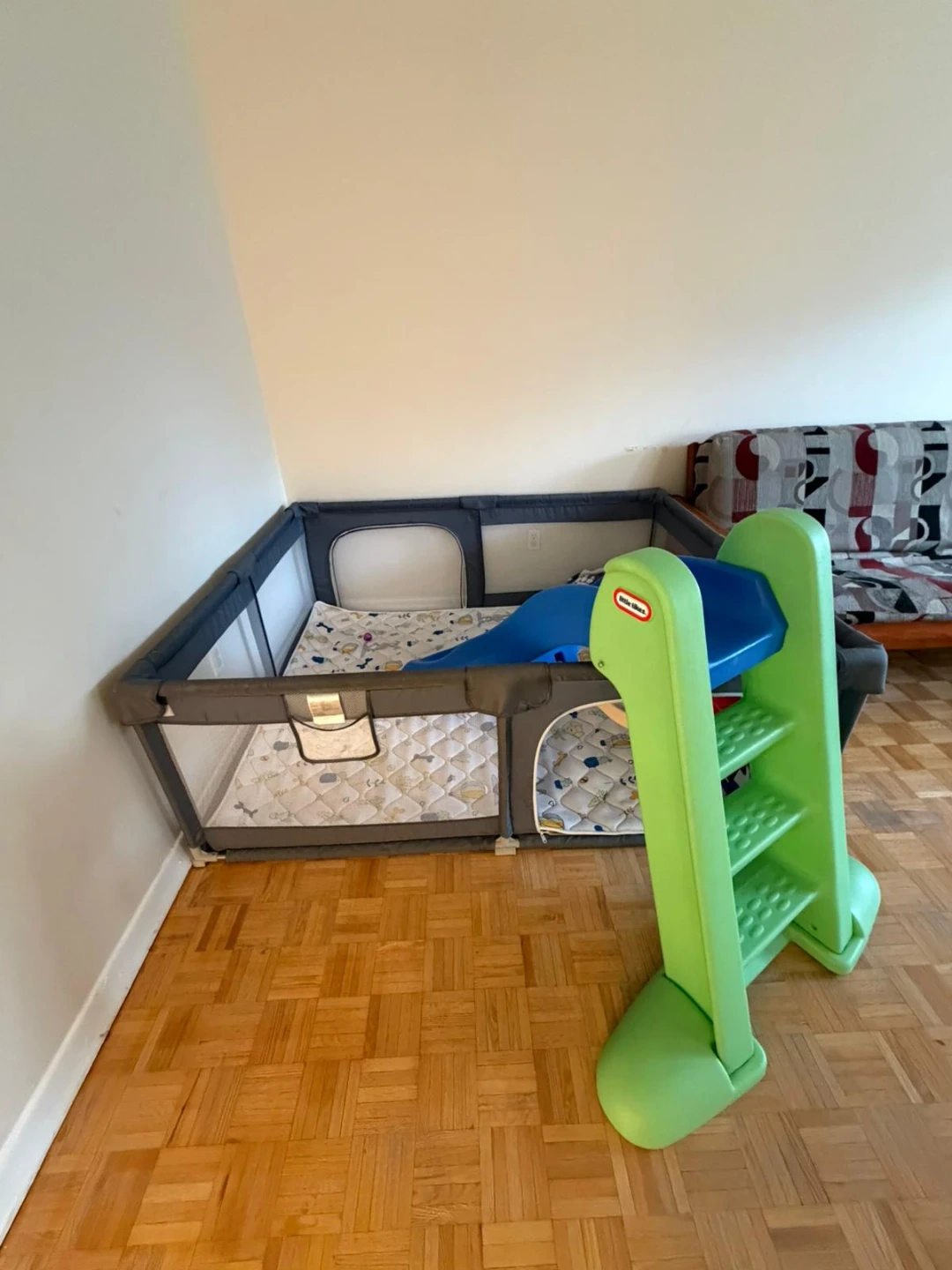 This Little Tikes set includes a junior play slide and a playpen. The slide is green and blue, and the playpen is grey with a patterned mat inside. It's great for keeping little ones entertained and safe indoors!