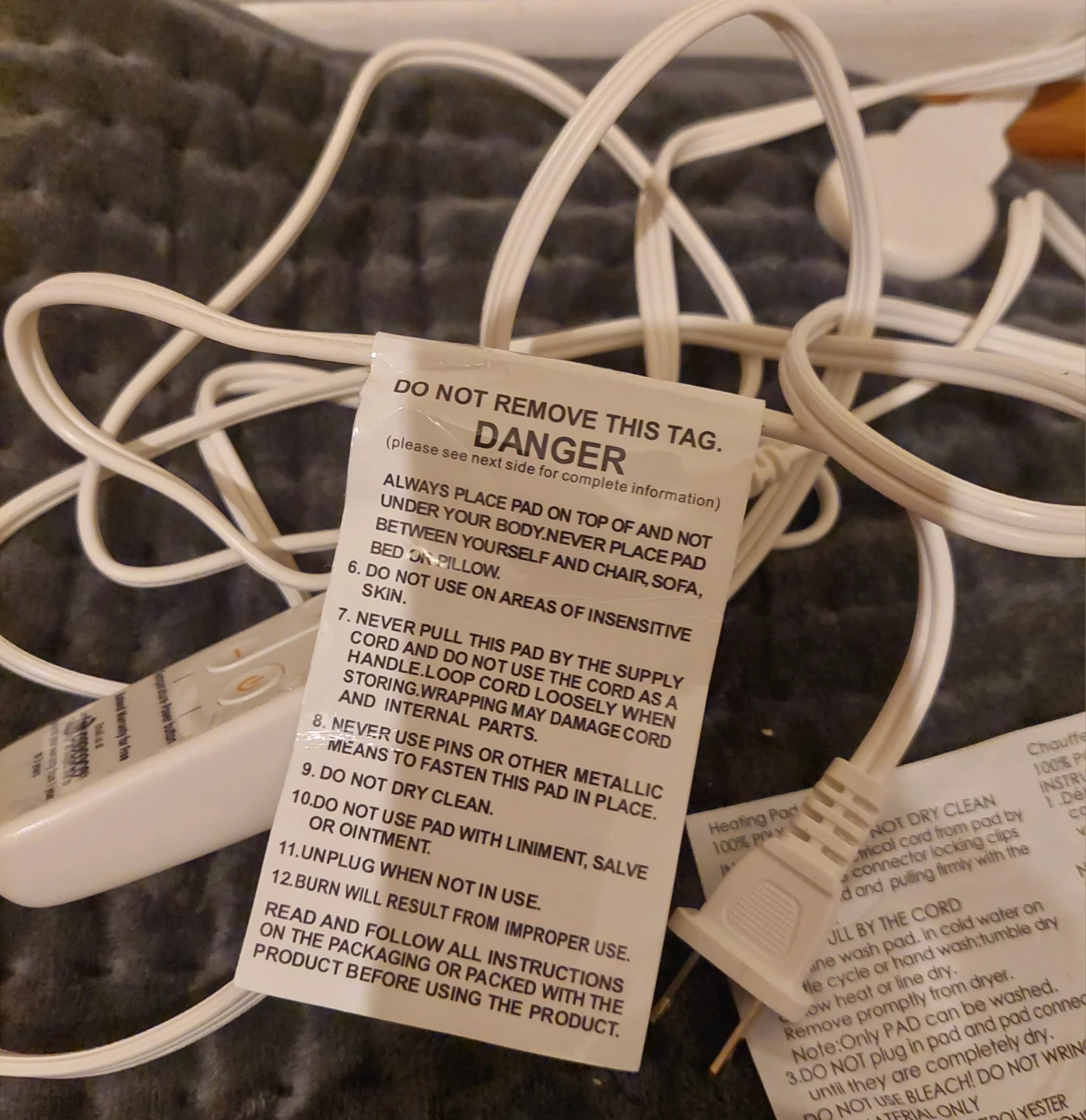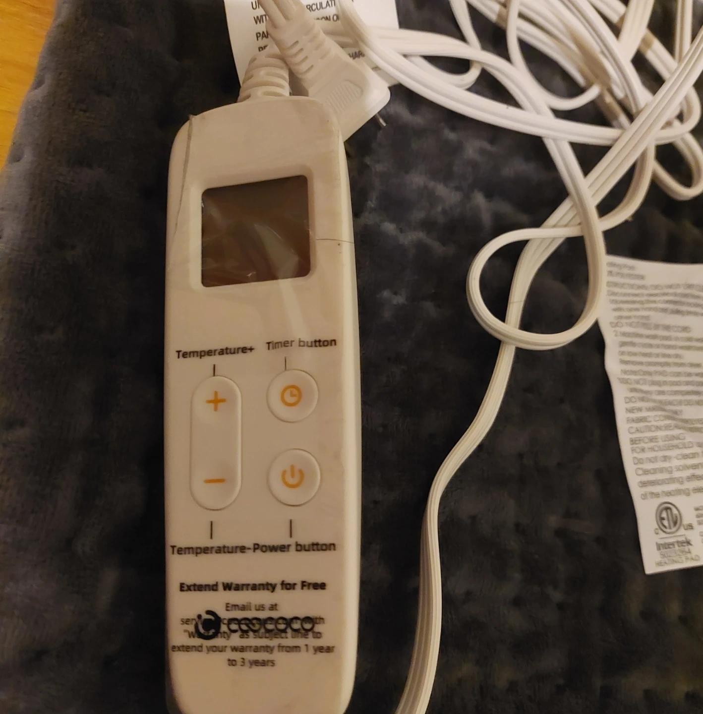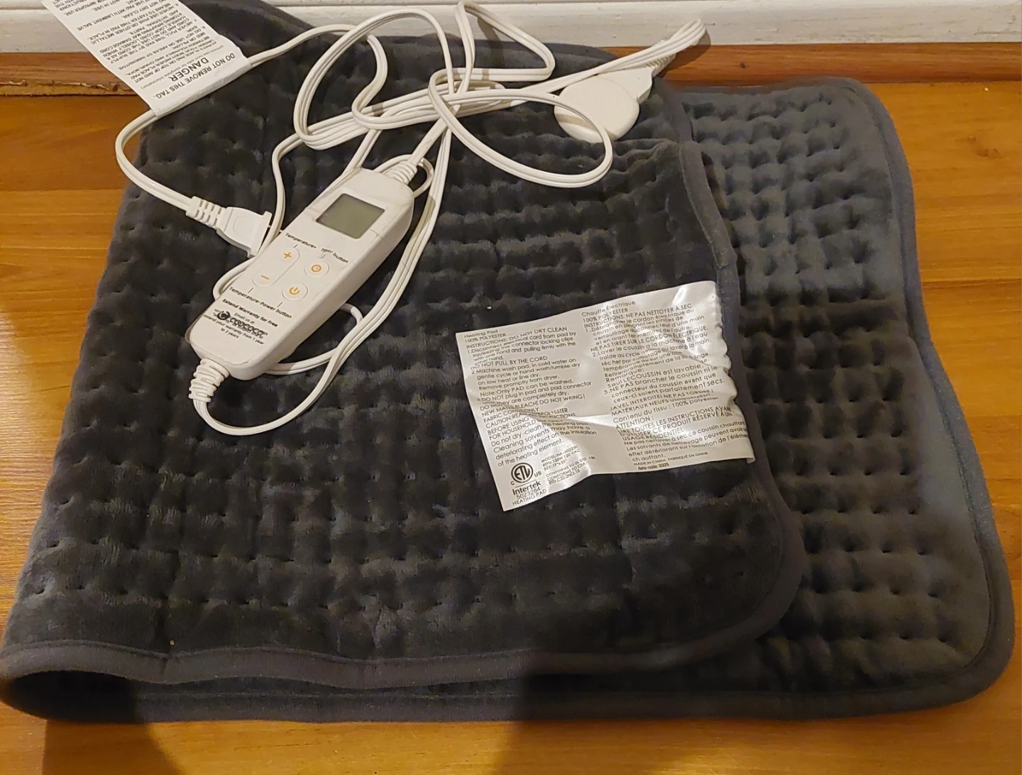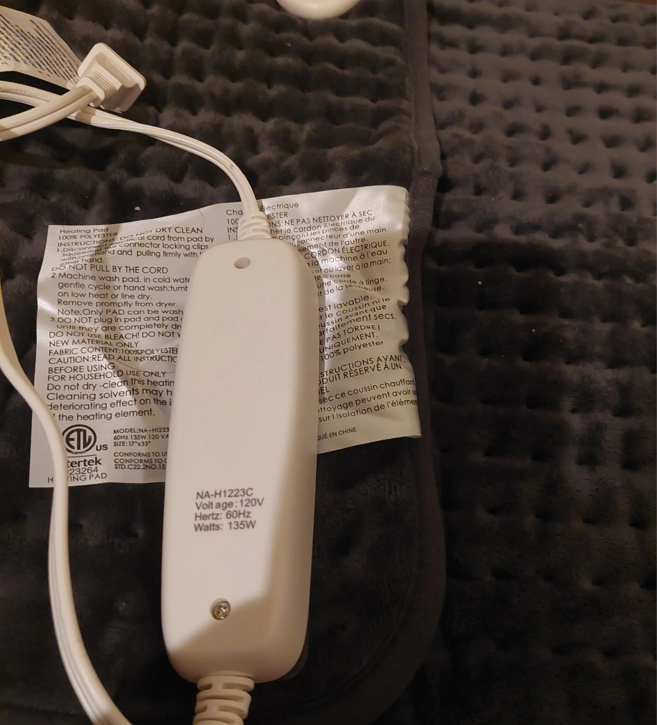 This is a dark grey electric heating pad with a digital controller. It measures 17"x33" and is made of 100% polyester. It plugs into a 120V outlet and has a wattage of 135W. Perfect for soothing aches and pains.