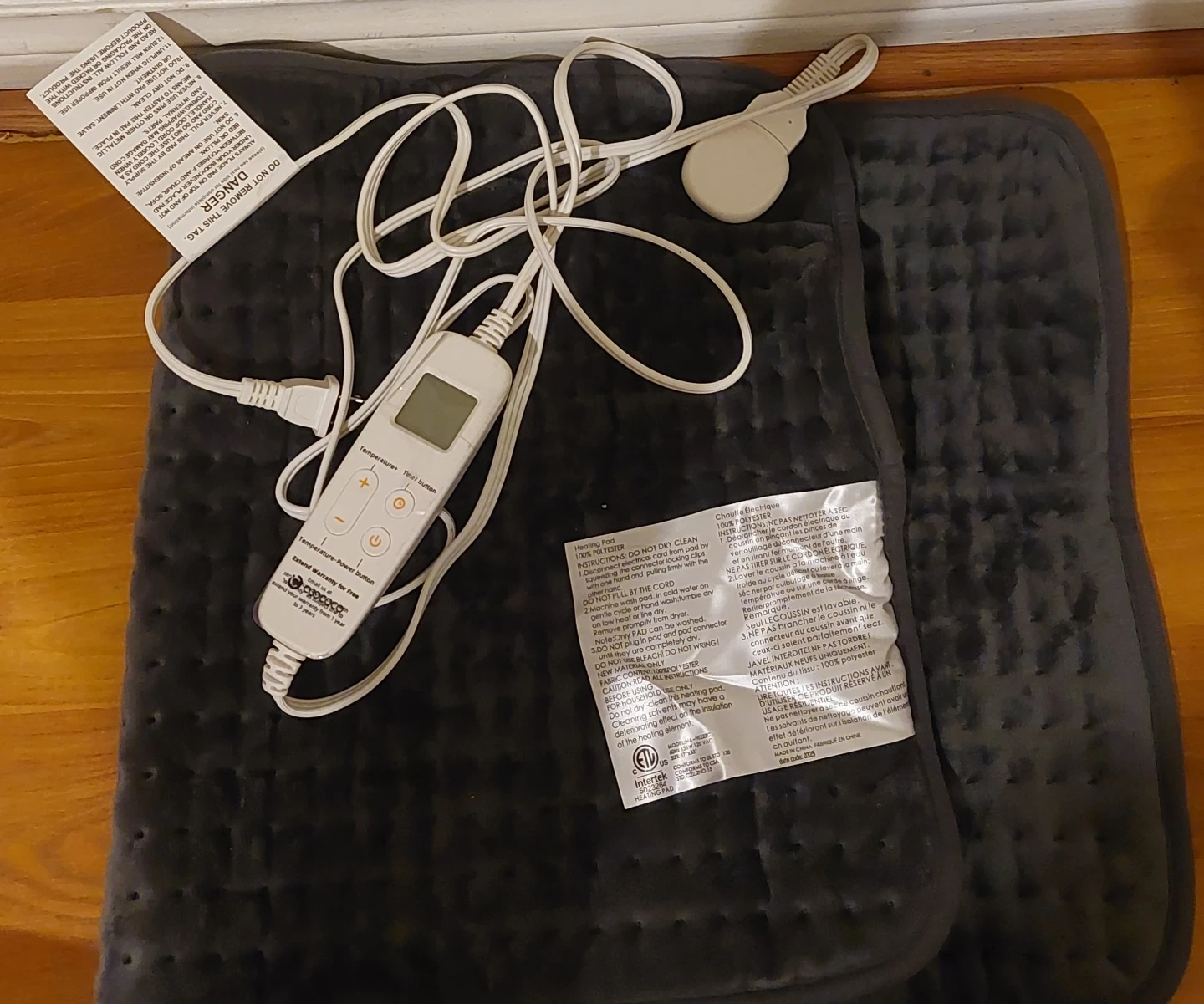 This is a dark grey electric heating pad with a digital controller. It measures 17"x33" and is made of 100% polyester. It plugs into a 120V outlet and has a wattage of 135W. Perfect for soothing aches and pains.