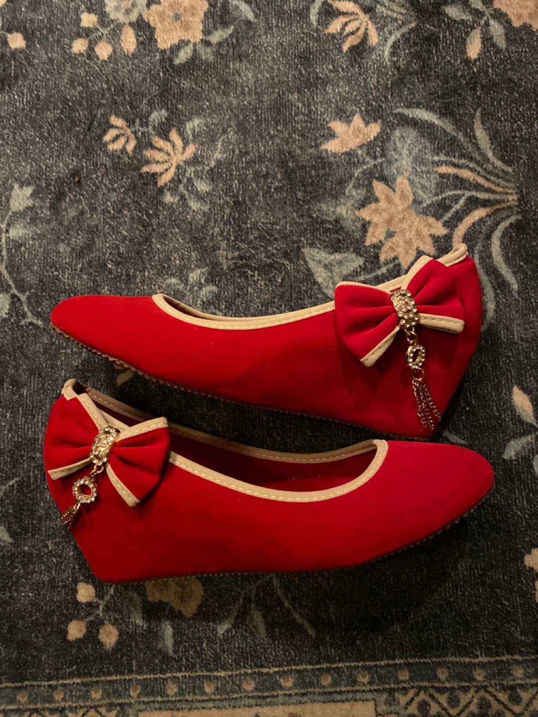 These red shoes feature a cute bow detail and a cream-coloured trim. They're perfect for adding a pop of colour to any outfit!