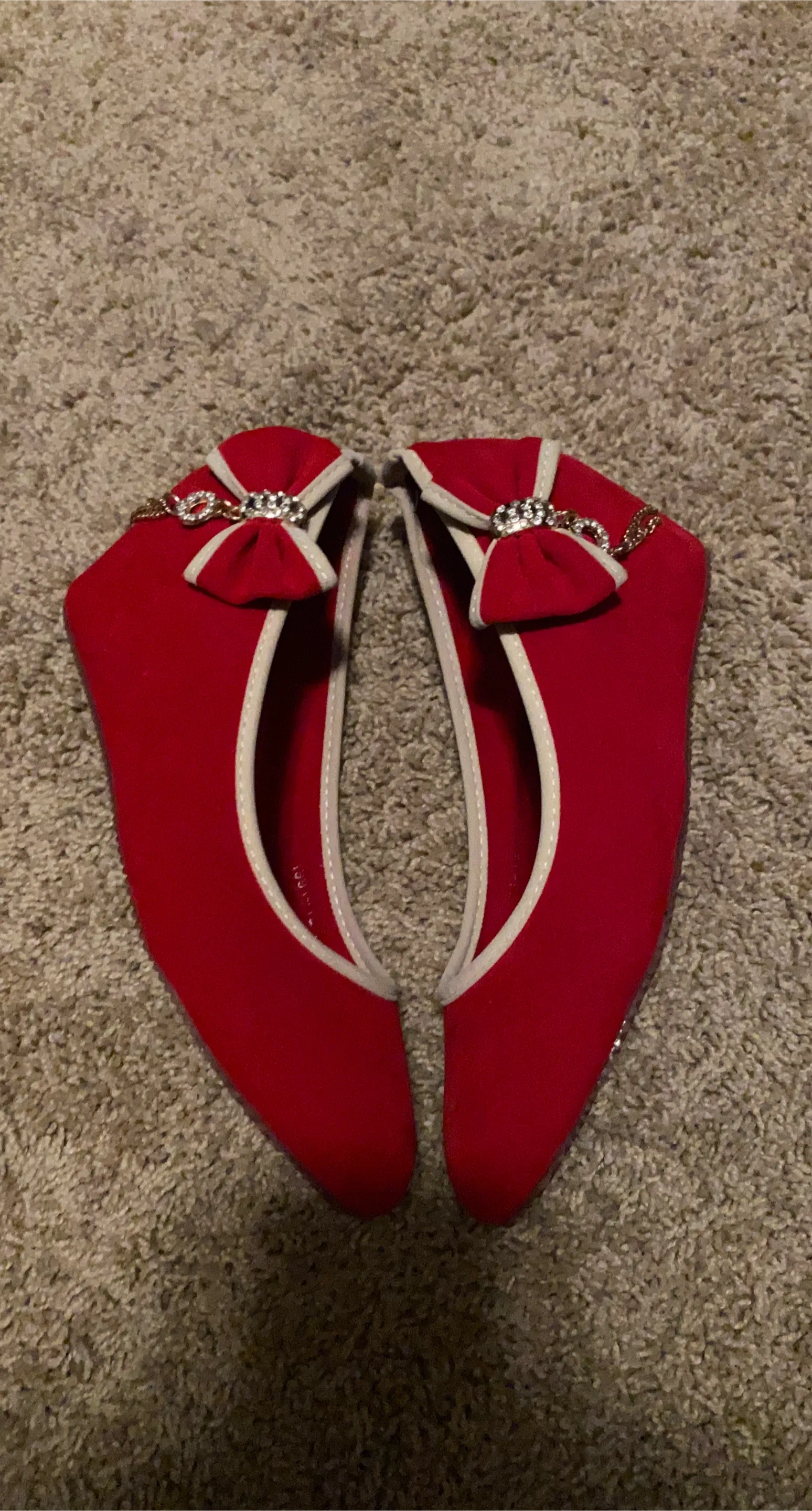 These red shoes feature a cute bow detail and a cream-coloured trim. They're perfect for adding a pop of colour to any outfit!