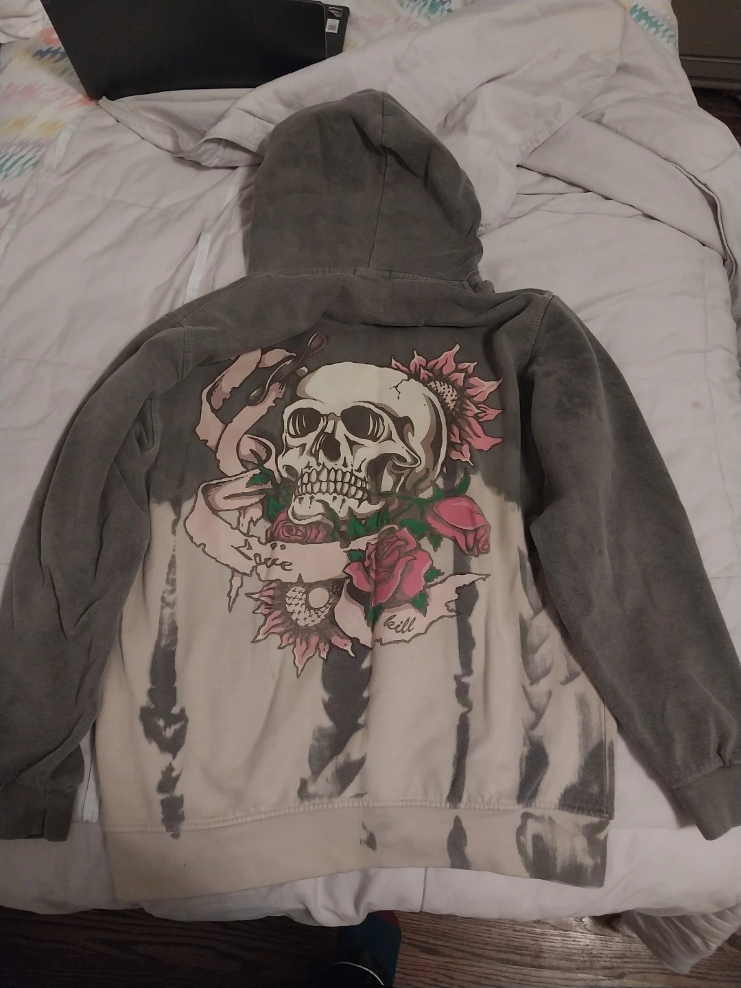 This Ed Hardy hoodie features a tie-dye wash and a prominent skull and roses graphic on the back. It's a comfortable, long-sleeved hooded sweatshirt with a front kangaroo pocket. Great for casual wear!