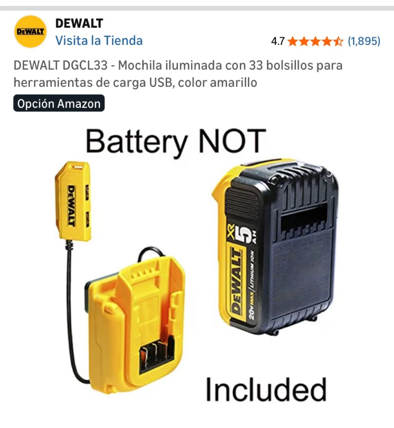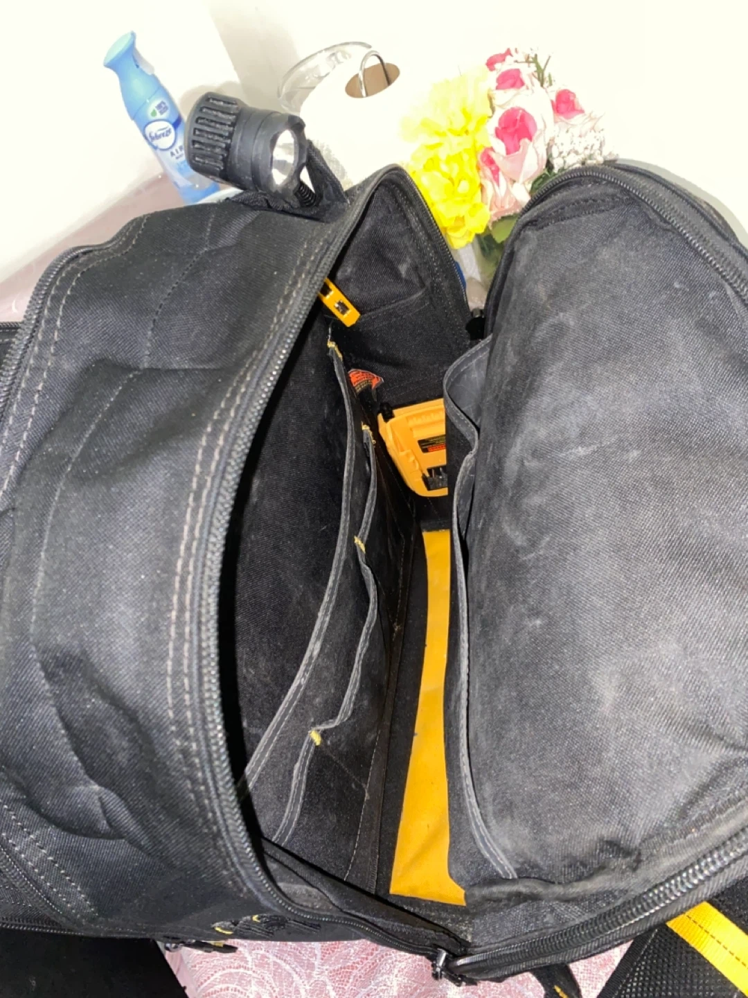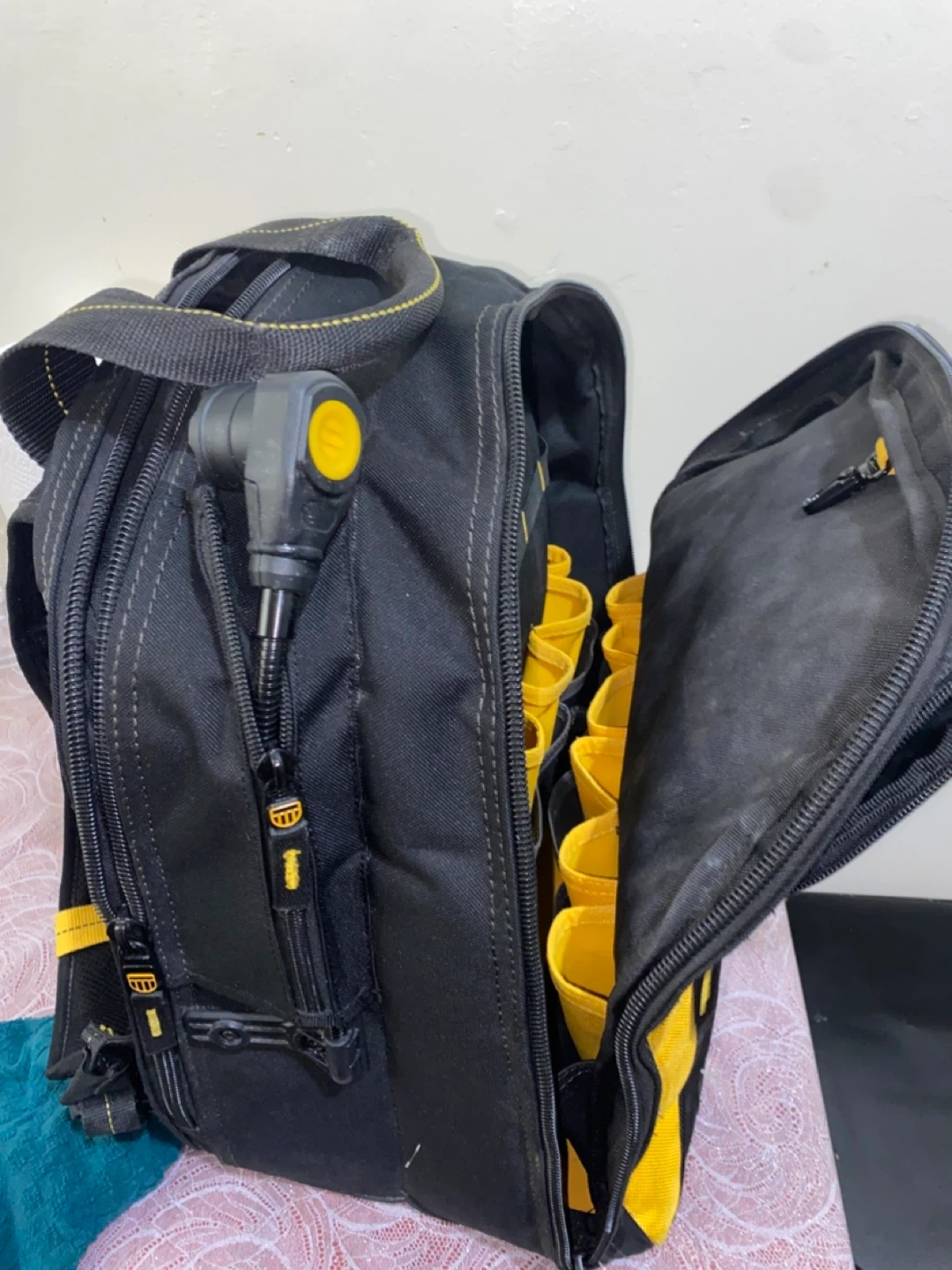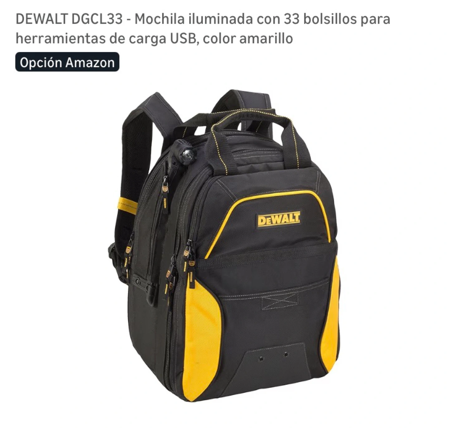 This is a DEWALT DGCL33 tool backpack. It's black and yellow with 33 pockets. Features USB charging and an integrated LED light.
