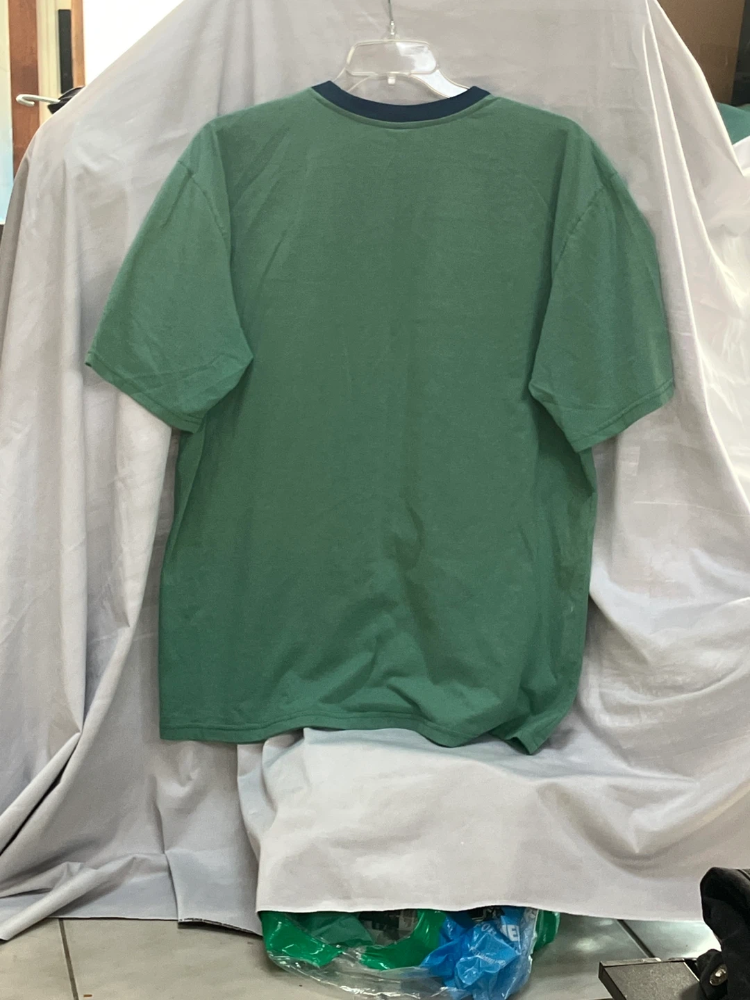 Green t-shirt with "Beethoven Jeans" graphic. Short sleeves and crew neck. Casual brand, 100% cotton material.