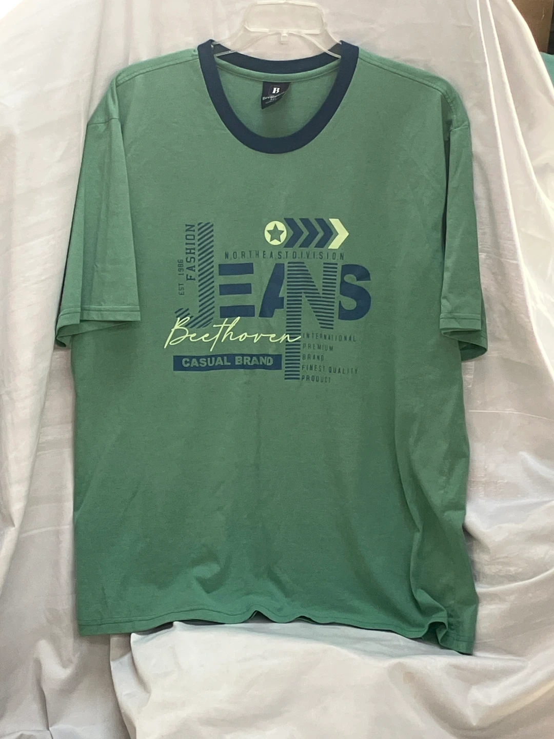 Green t-shirt with "Beethoven Jeans" graphic. Short sleeves and crew neck. Casual brand, 100% cotton material.