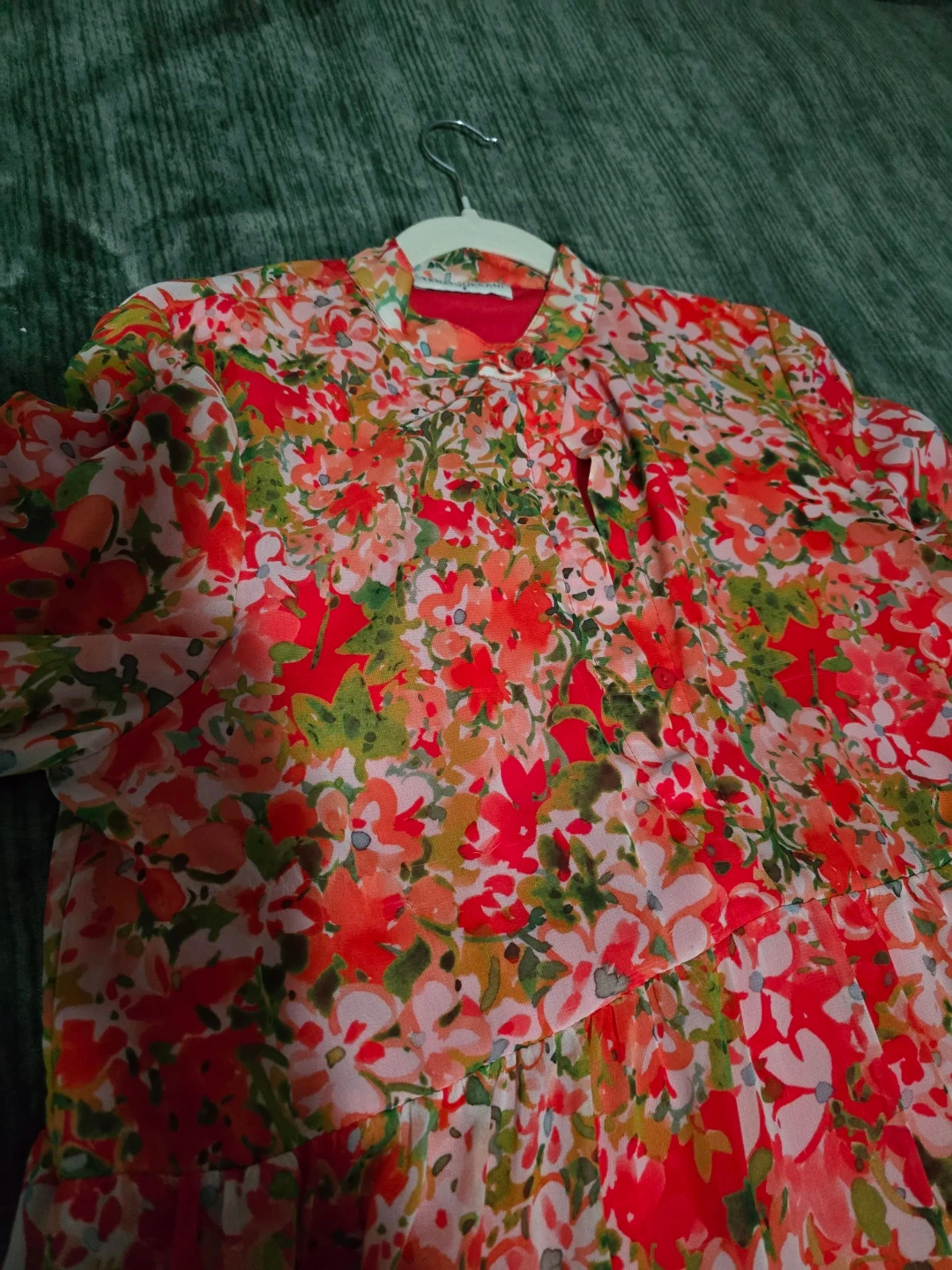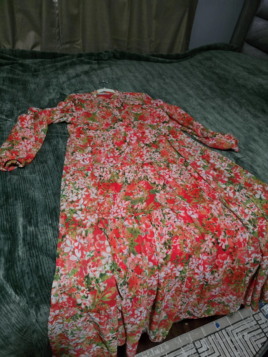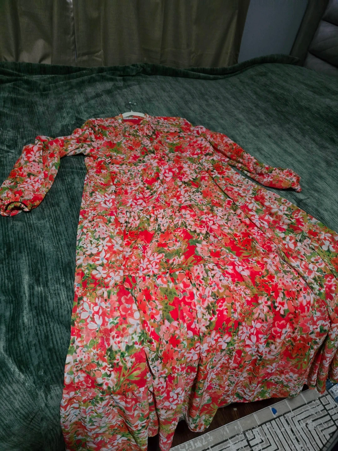 Pretty Terzi Sukkanni floral maxi dress. Features a vibrant floral print with long sleeves and a button-up neckline. It's lightweight and flowy!