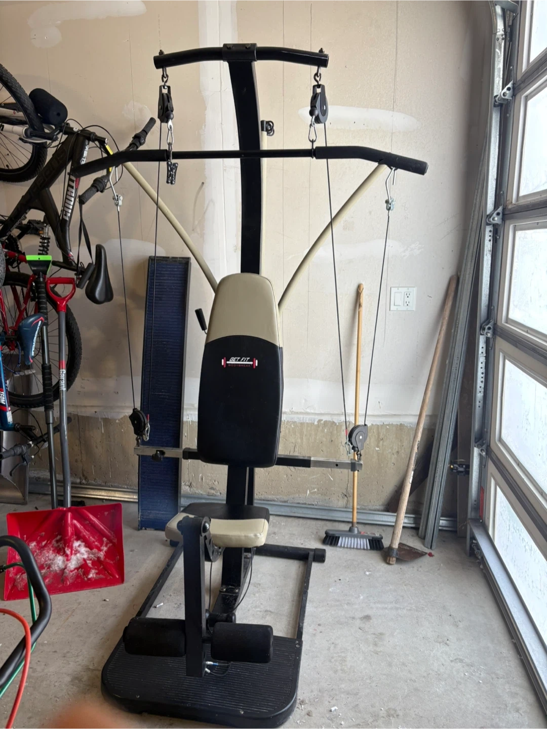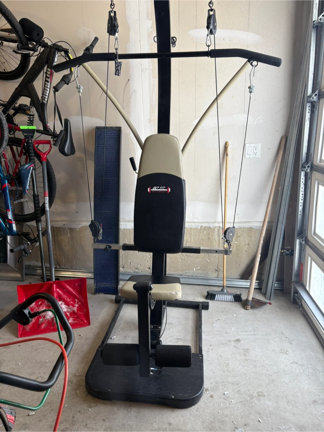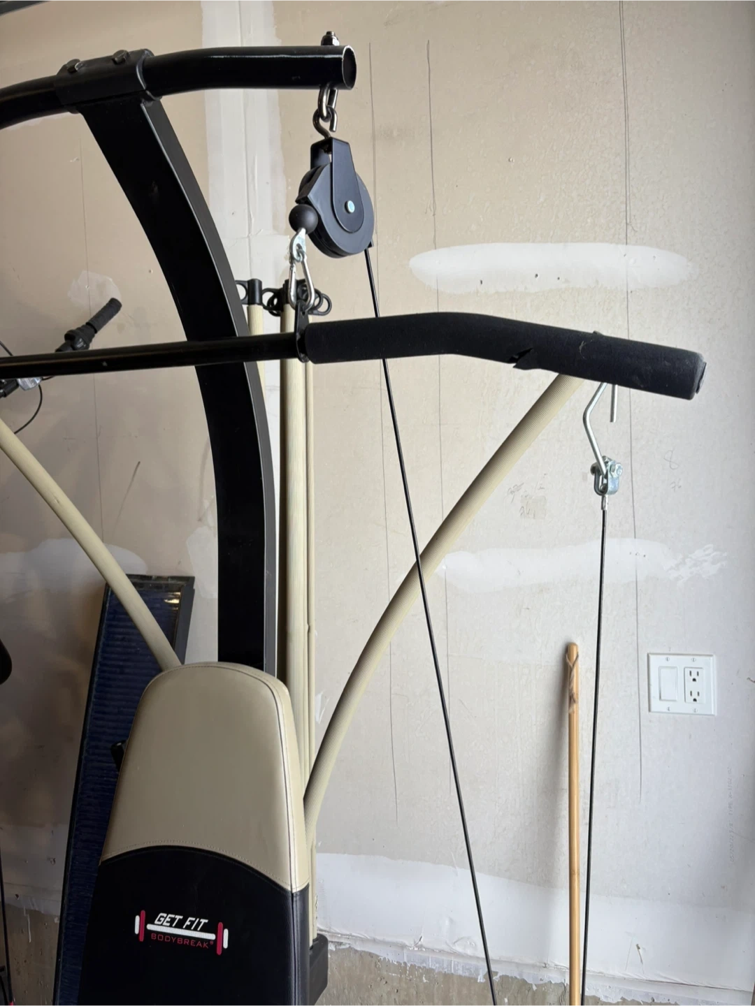 This Get Fit Bodybreak home gym system is designed for a full-body workout. It features a comfortable padded seat and backrest. It's a great addition to your home fitness routine!