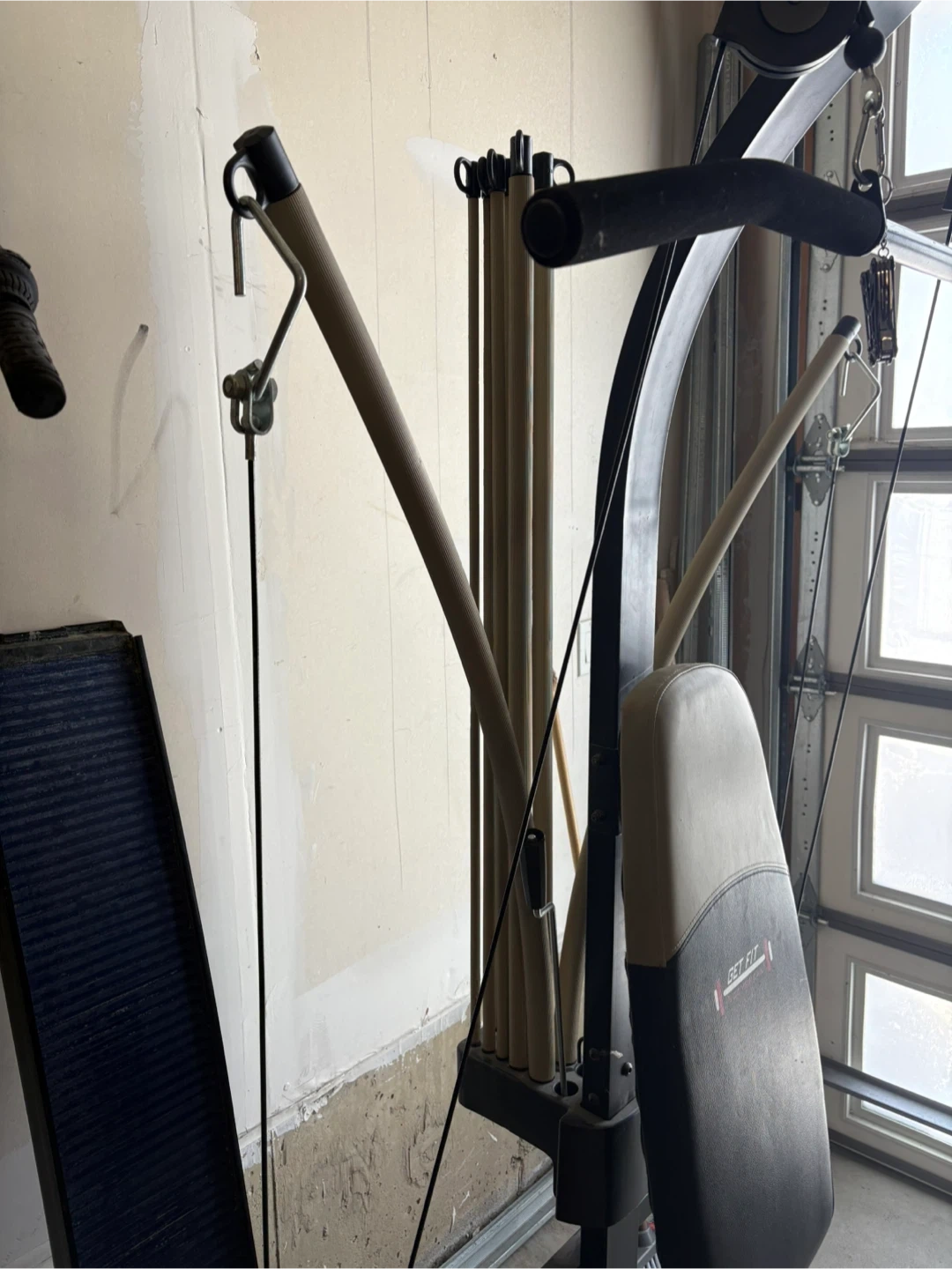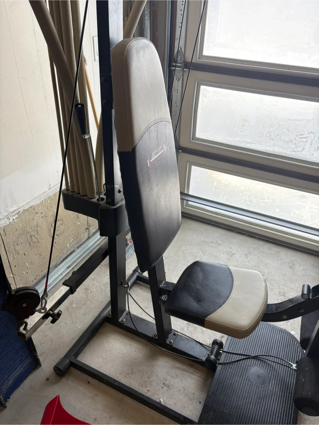 This Get Fit Bodybreak home gym system is designed for a full-body workout. It features a comfortable padded seat and backrest. It's a great addition to your home fitness routine!