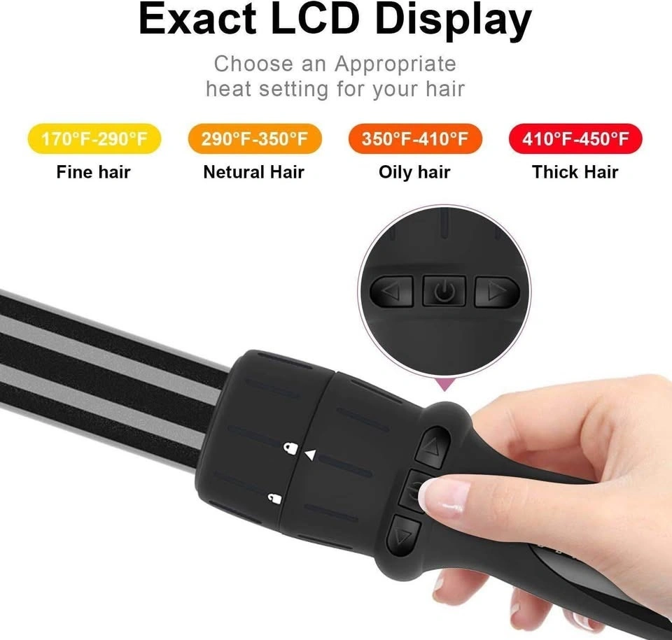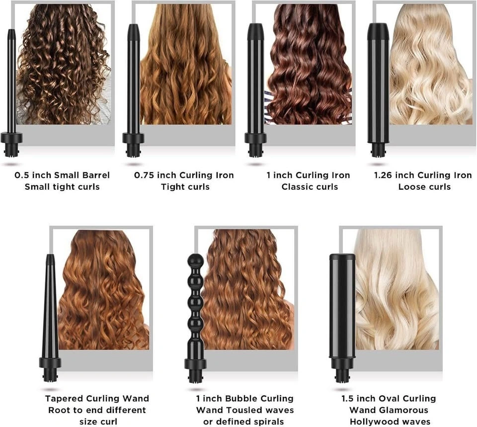 7-IN-1 Curling Wand Set for Curls - 7 interchangeable wands add up to endless styling possibilities. The Parwin Pro brings you our largest assortment of tourmaline ceramic barrels with an easy-to-use, 7-in-1 interchangeable base for a full spectrum of curling options. Digital Temperature Control Heats up to 450 degreesF in seconds, Negative ion conditioning technology, digital display with temperature control, LCD screen light changes from blue to green when desired temperature is reached. Seven Sizes & Pro version for salon 13mm barrel , 19mm barrel, 25mm barrel, 32mm barrel, Bubble barrel, 26mm Cone, Oval barrelachieve every ringlet, curl, spiral or wave imaginable! It's perfect for travel and staying organized. 2.5m fully rotating swivel power cord, and auto-cover from 110V to 240V which make it easily adaptable across the global. 100% Tourmaline Ceramic Barrels Our pure tourmaline ceramic styling tools are safe for all hair types and achieve gorgeous results with any hair thickness, including damaged, dyed, fine, medium or coarse. The results speak for themselves: curls practically any way you want them, with a smooth cuticle and healthy shine!
