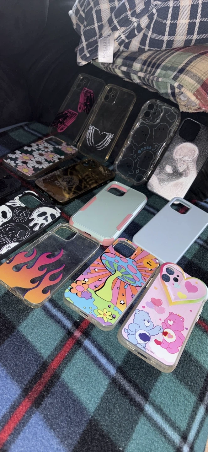 A collection of various phone cases with different designs. Includes clear cases with graphics, patterned cases, and glittery options. Selling for 1$ each and the iPhone XR I’ll give all for 10$ or 1$ each as well.