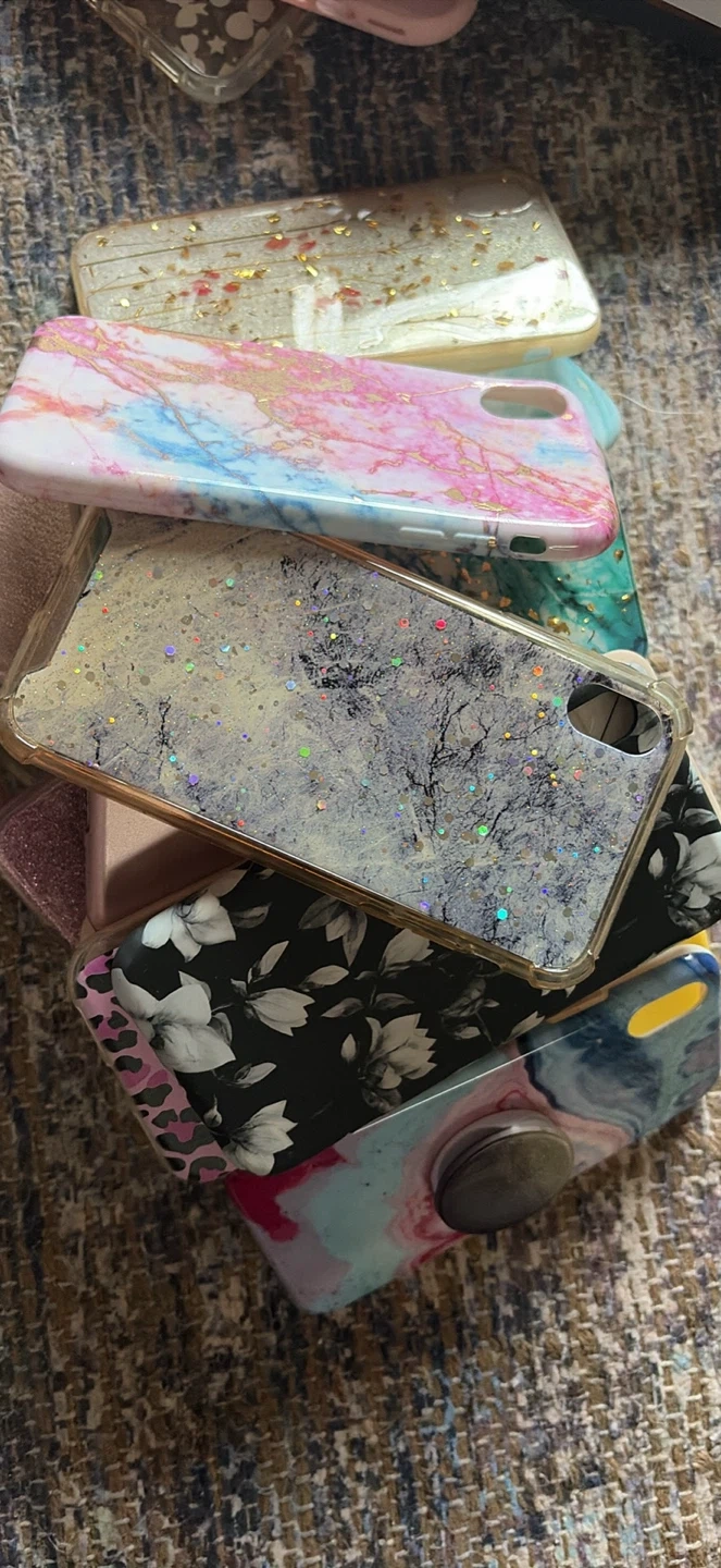 A collection of various phone cases with different designs. Includes clear cases with graphics, patterned cases, and glittery options. Selling for 1$ each and the iPhone XR I’ll give all for 10$ or 1$ each as well.