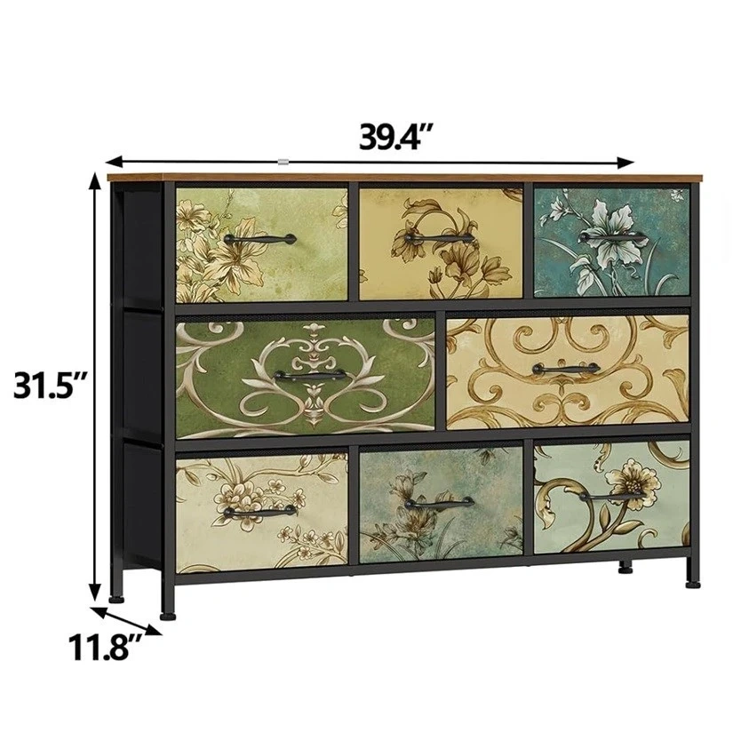 This dresser features a wood top and a metal frame. It's 39.4 inches wide, 31.5 inches tall, and 11.8 inches deep. The fabric drawers have unique floral patterns. It's great for organizing your clothes and accessories!