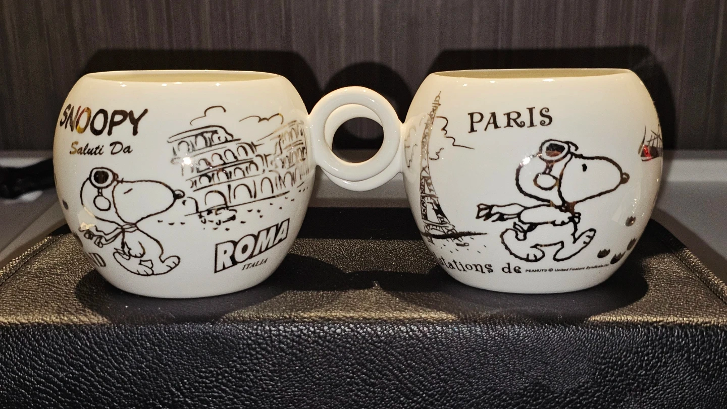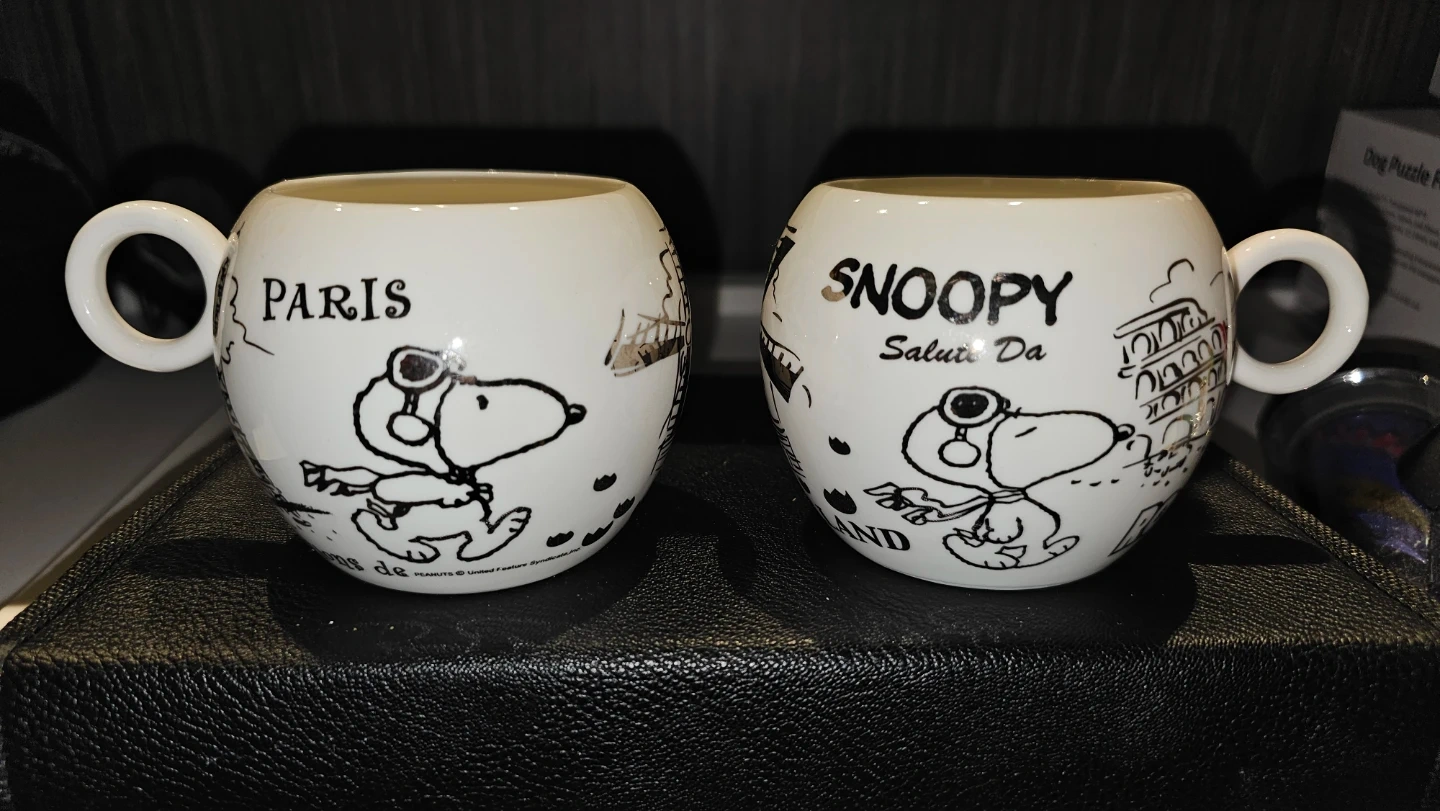 Set of two ceramic mugs featuring Snoopy with Paris and Rome themes.