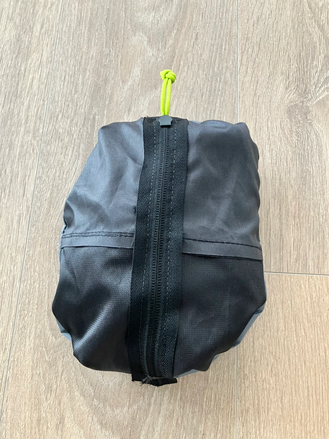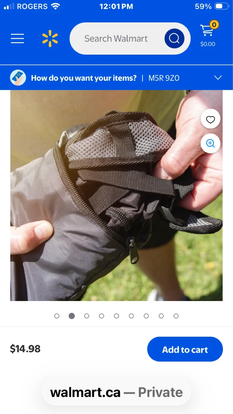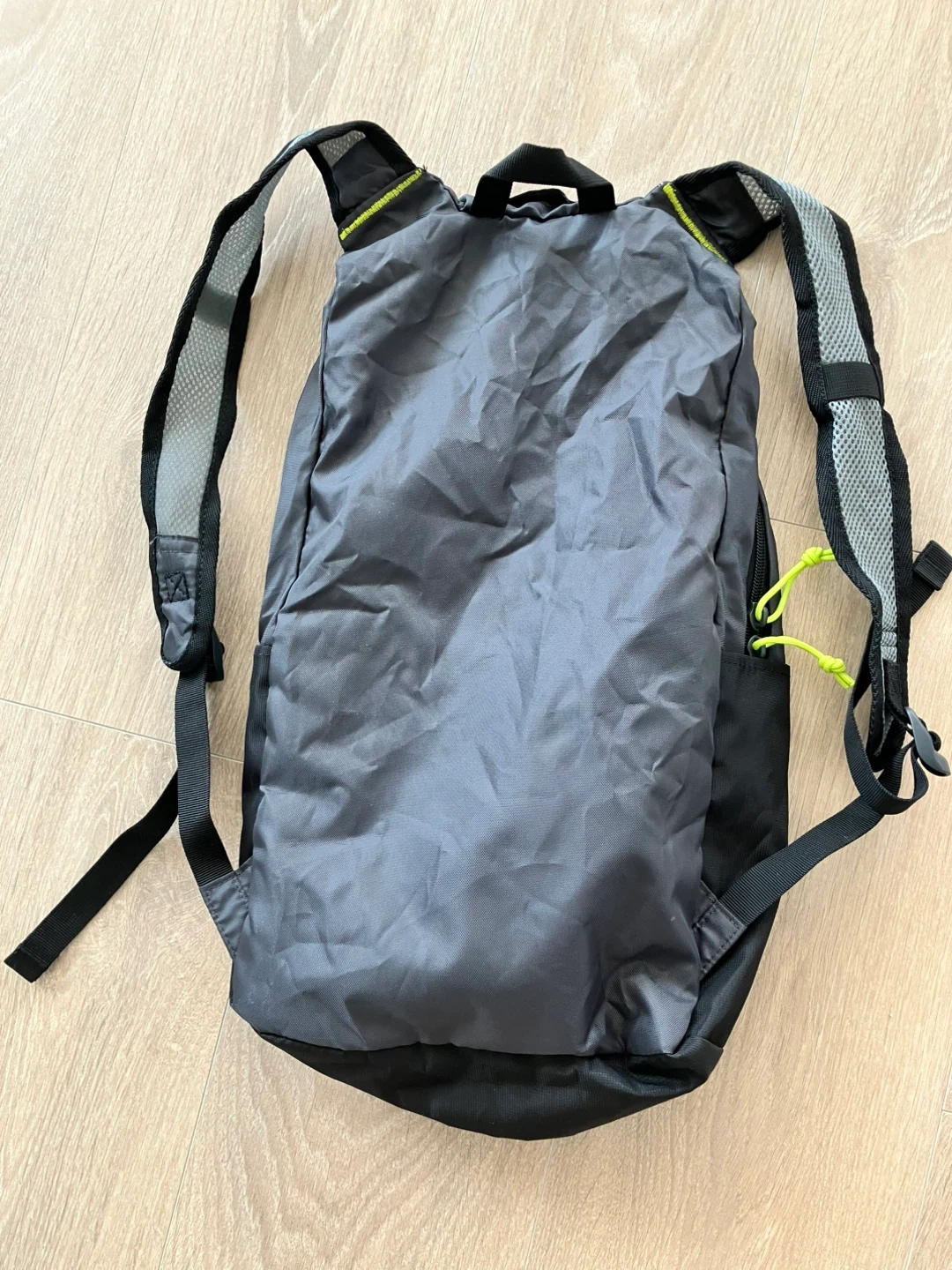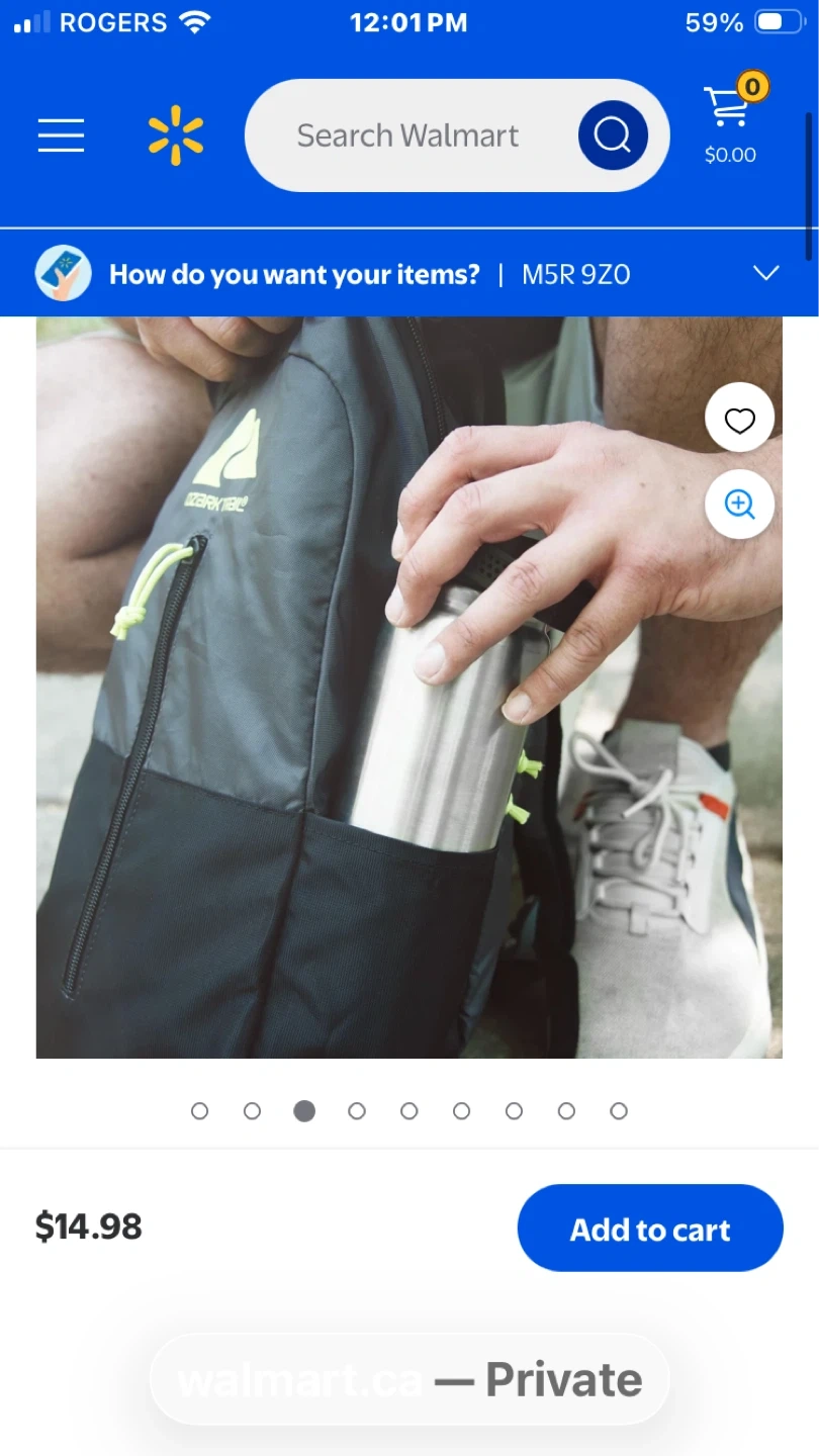This Ozark Trail backpack is grey with yellow accents. It features a main compartment and a front zip pocket. Adjustable shoulder straps for comfort.