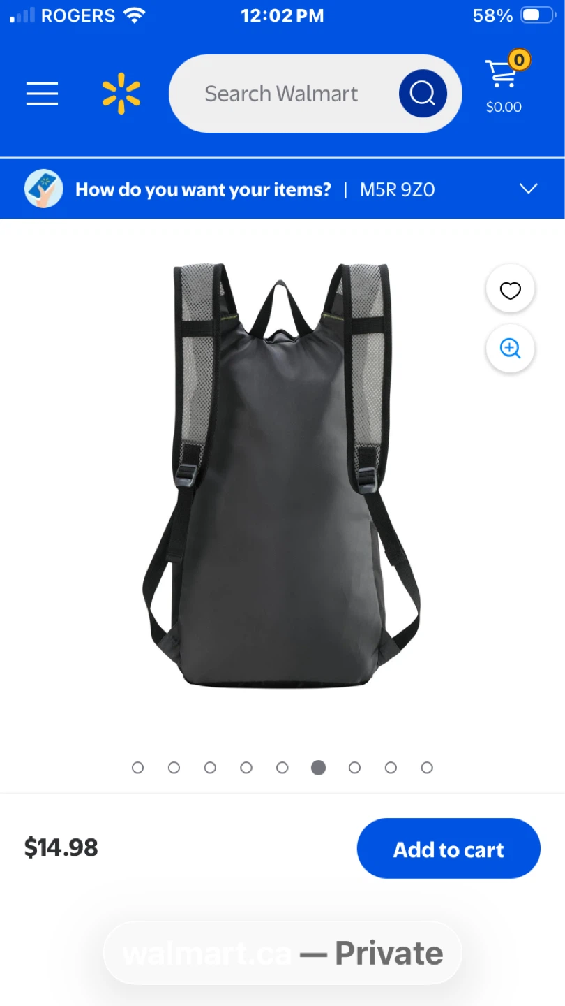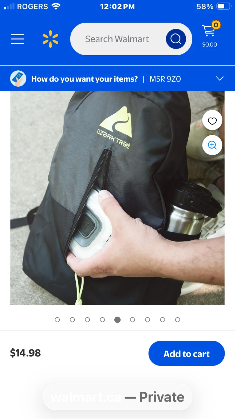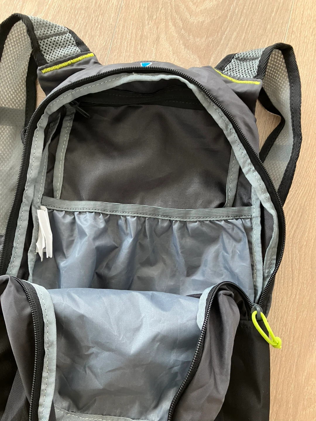 This Ozark Trail backpack is grey with yellow accents. It features a main compartment and a front zip pocket. Adjustable shoulder straps for comfort.