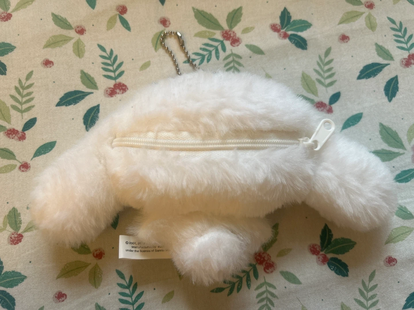 This is a super soft, white Cinnamoroll plush coin purse with a zipper closure and a metal keychain.