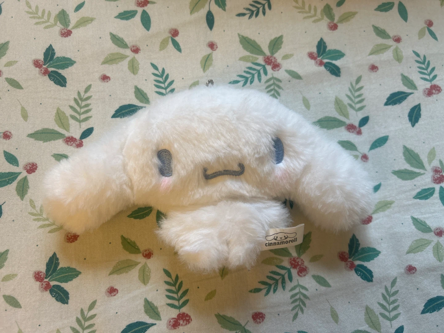 This is a super soft, white Cinnamoroll plush coin purse with a zipper closure and a metal keychain.