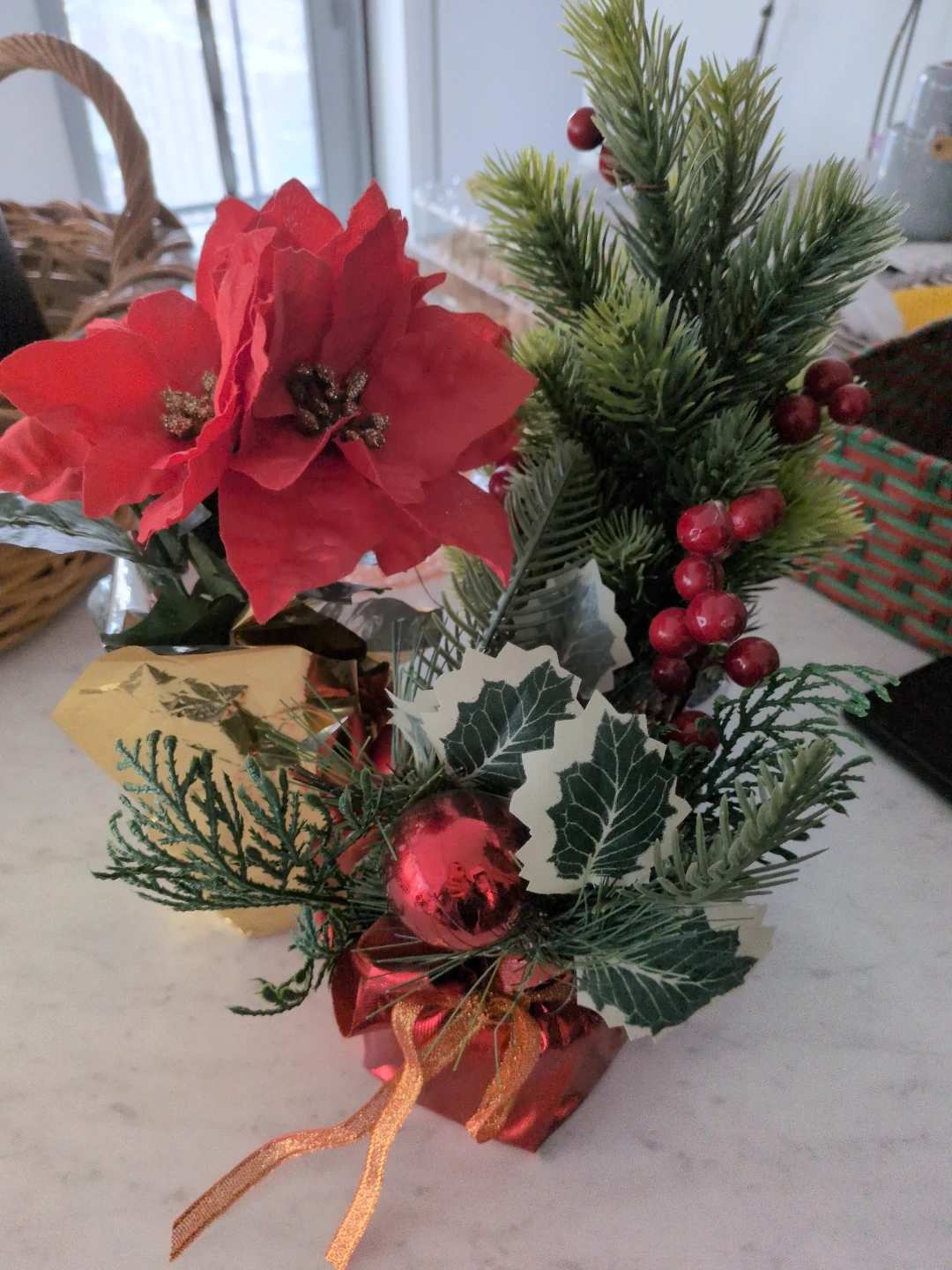 3 Festive small Christmas arrangement featuring a red poinsettia, faux pine sprigs, and red berries. Perfect for a small table or shelf decoration during the holidays!