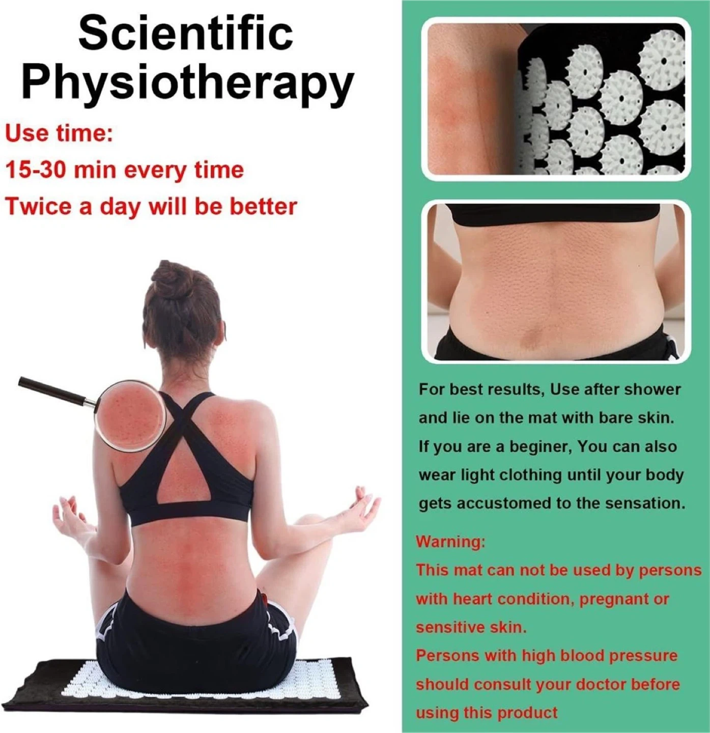 This acupressure mat and pillow set is designed for relaxation and pain relief. It features numerous plastic spikes to stimulate pressure points on the body. Includes a carry bag for easy transport. Use for 15-30 minutes at a time, twice a day for best results. Not for use by persons with heart conditions, pregnancy, or sensitive skin. Consult your doctor if you have high blood pressure.