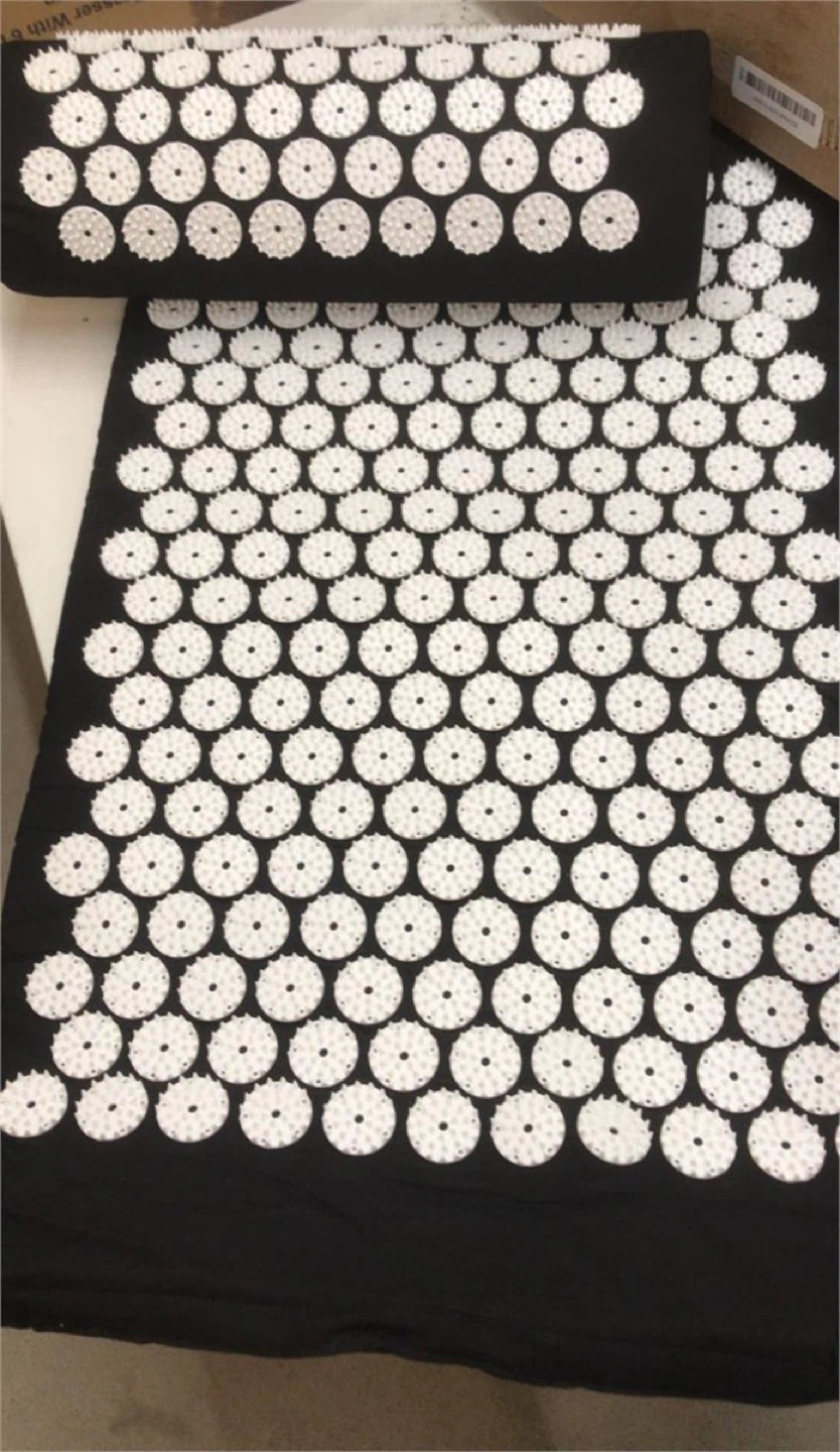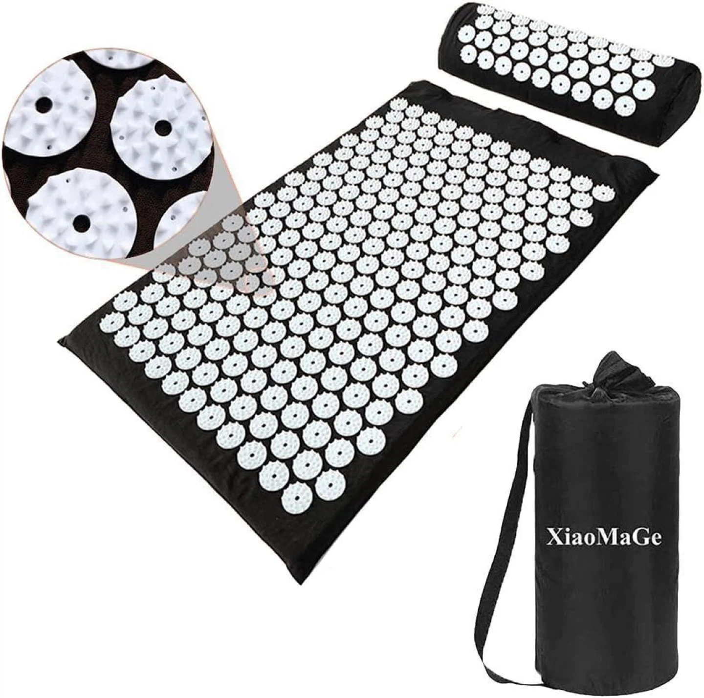 This acupressure mat and pillow set is designed for relaxation and pain relief. It features numerous plastic spikes to stimulate pressure points on the body. Includes a carry bag for easy transport. Use for 15-30 minutes at a time, twice a day for best results. Not for use by persons with heart conditions, pregnancy, or sensitive skin. Consult your doctor if you have high blood pressure.