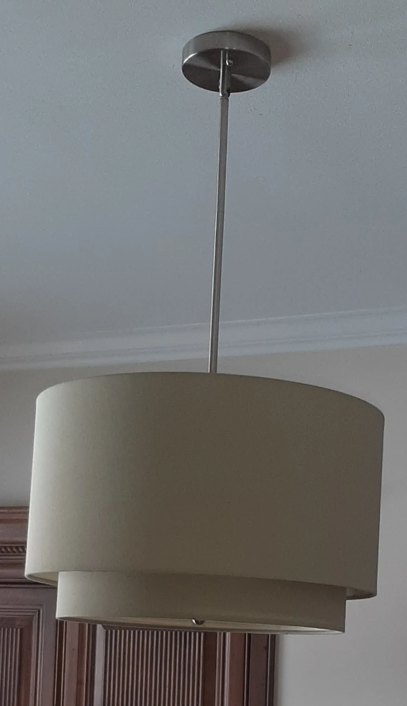 This tiered drum pendant light fixture has a neutral beige fabric shade. It's suspended from a brushed nickel rod and canopy. Provides a soft, diffused light for any room.
