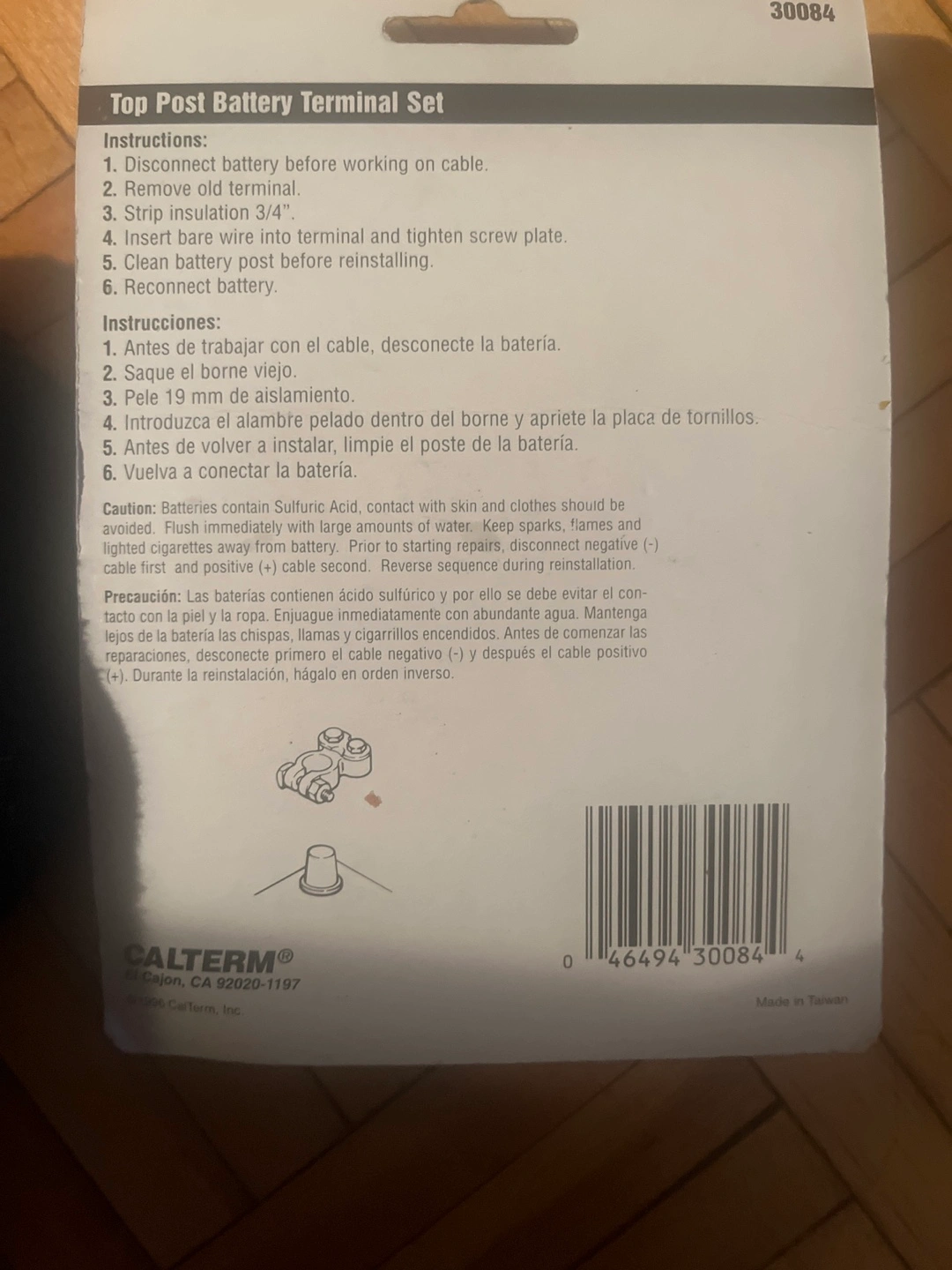 New in package. Heavy duty top post battery terminal set. Fits positive and negative posts. Includes two terminals.