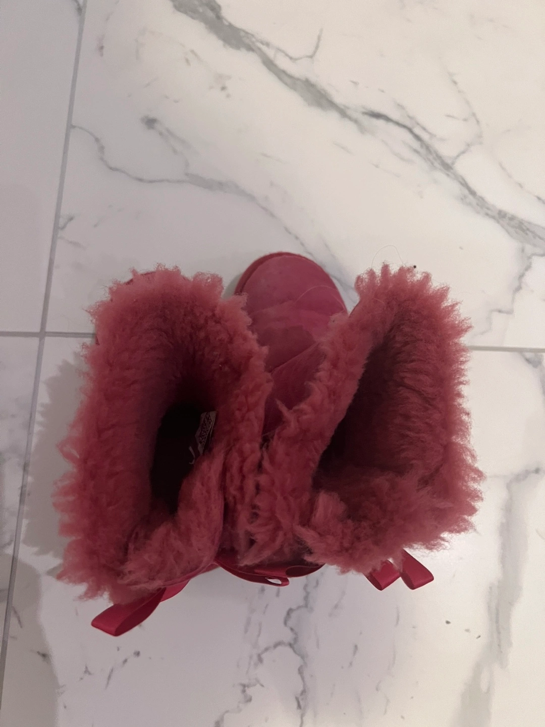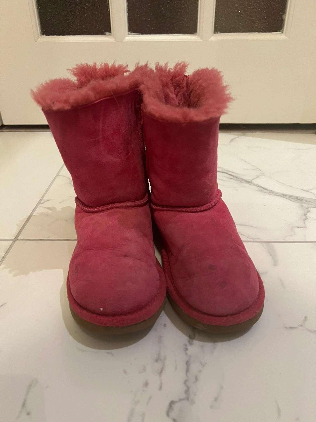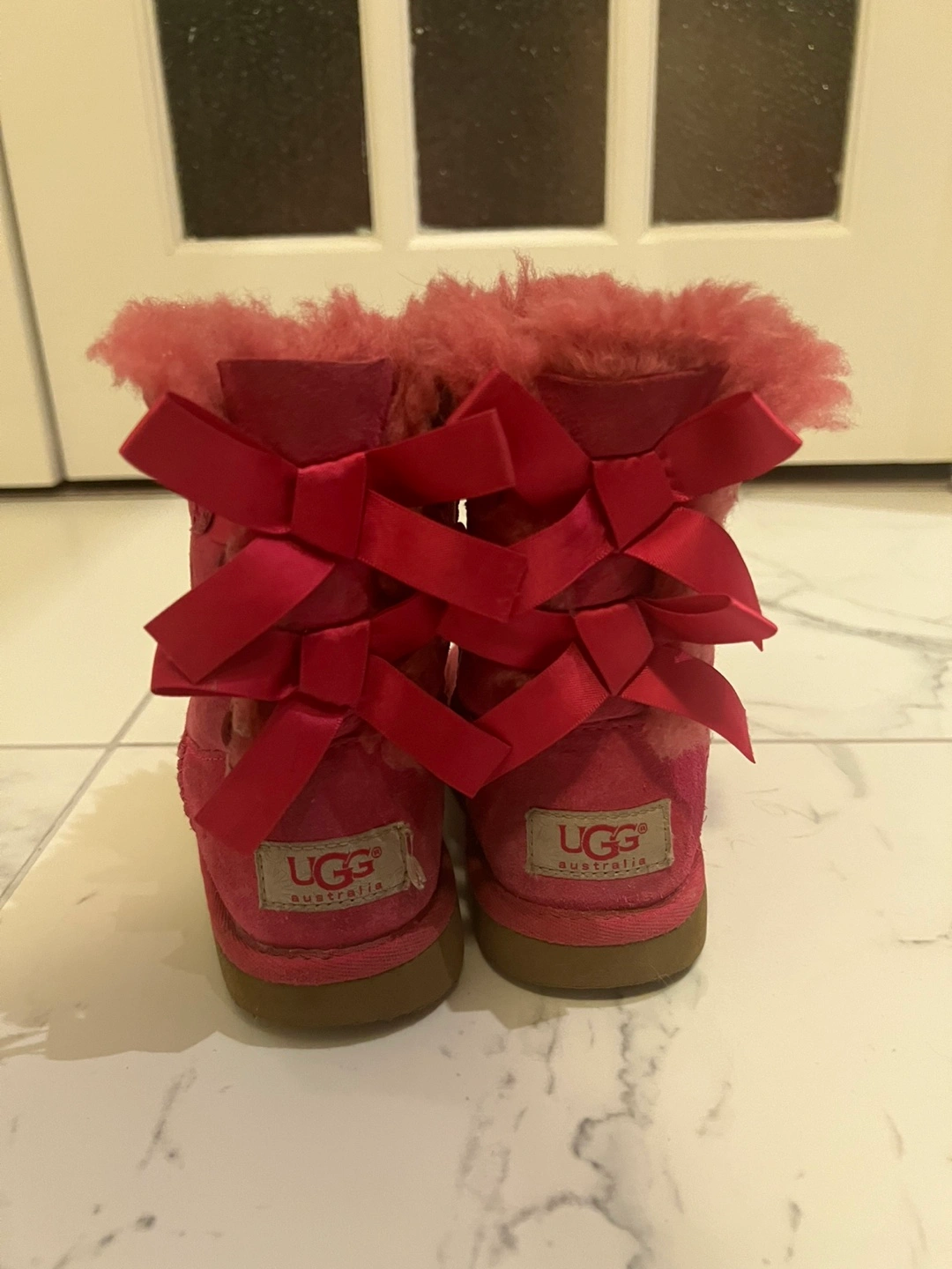 Adorable pink UGG boots. Features shearling lining and cute bows. Pre-owned, minor wear. Perfect for keeping little feet warm and stylish. Size 9T.