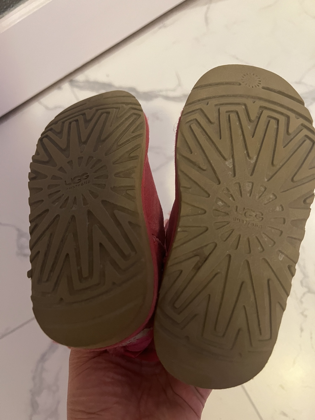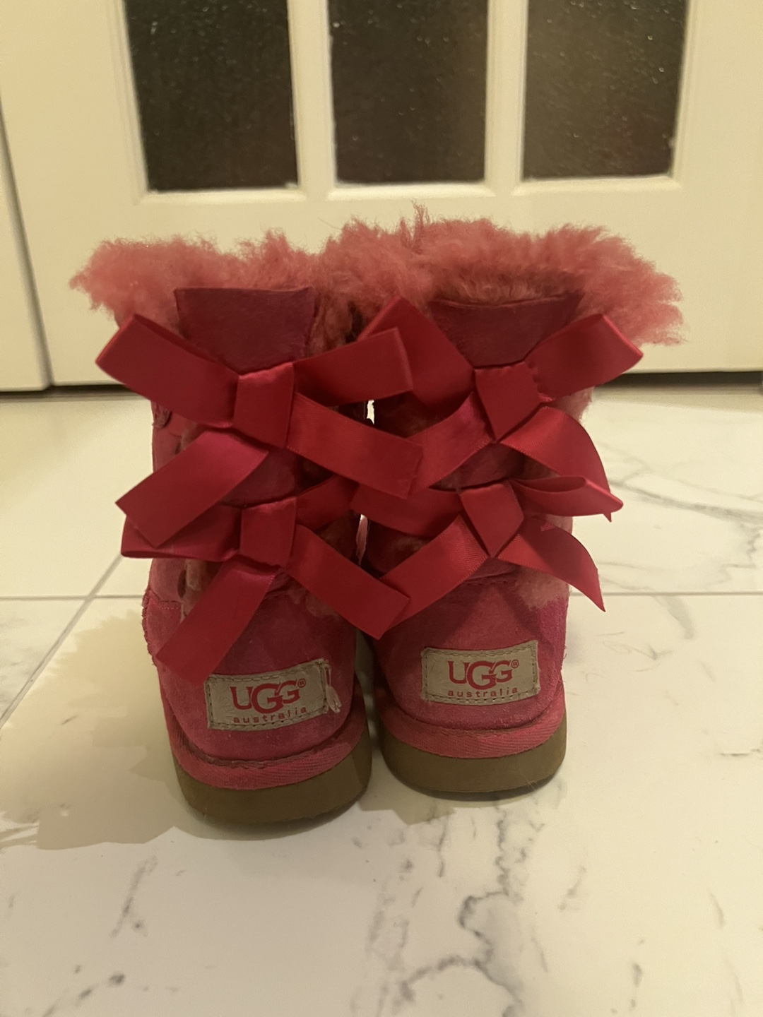 Adorable pink UGG boots. Features shearling lining and cute bows. Pre-owned, minor wear. Perfect for keeping little feet warm and stylish. Size 9T.