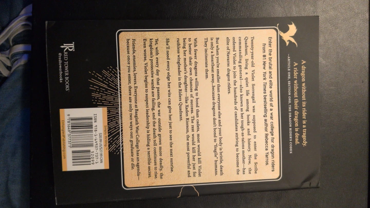 This is "Fourth Wing" by Rebecca Yarros, a #1 New York Times bestselling fantasy novel. It's an epic adventure about dragon riders. Includes bonus content, and originally bought at $27.99