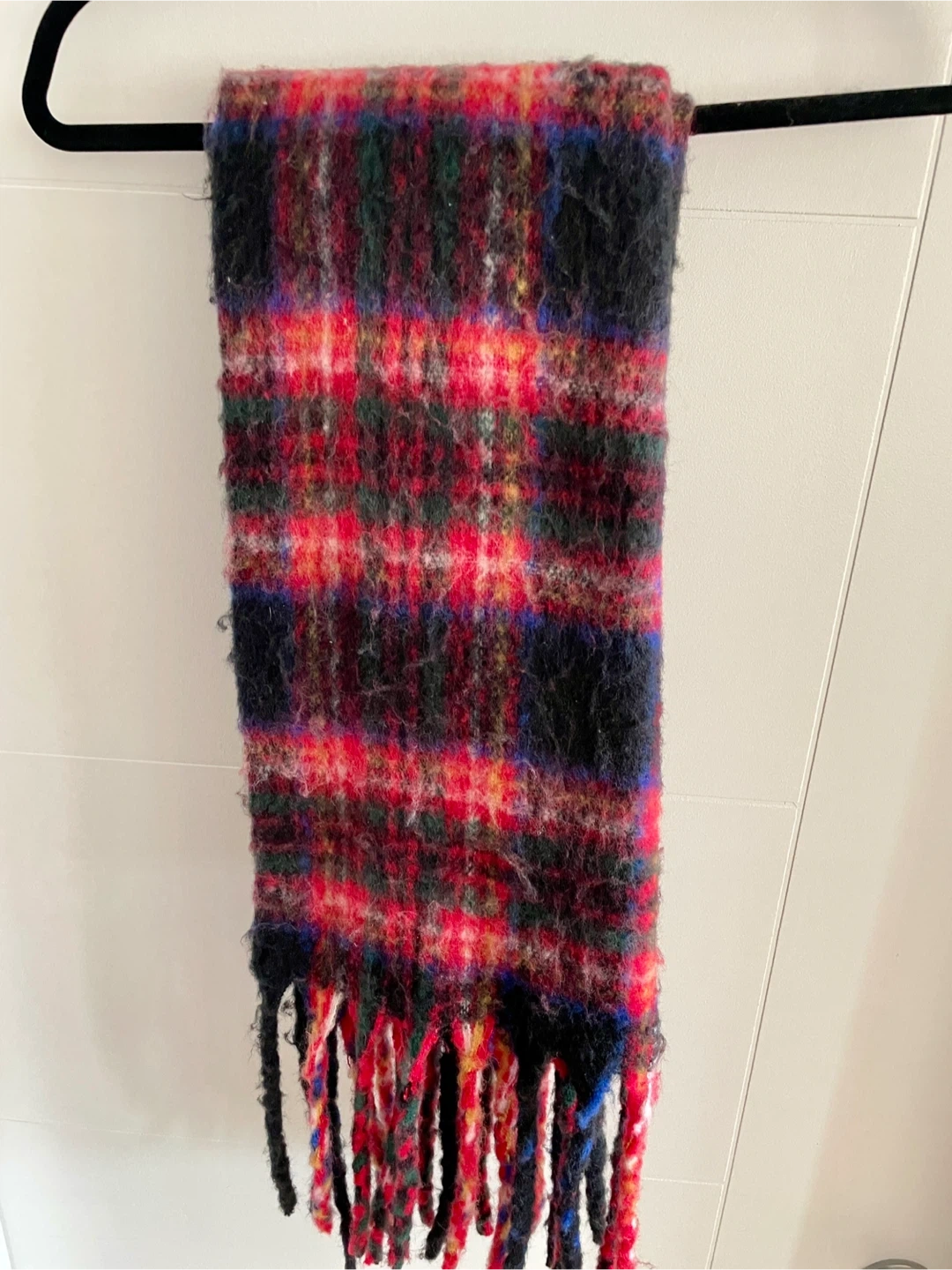 This warm tartan fluffy scarf features a vibrant plaid pattern. It has cozy vibes with fringed ends.