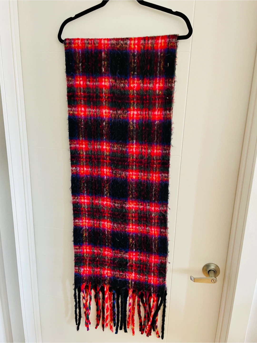 This warm tartan fluffy scarf features a vibrant plaid pattern. It has cozy vibes with fringed ends.