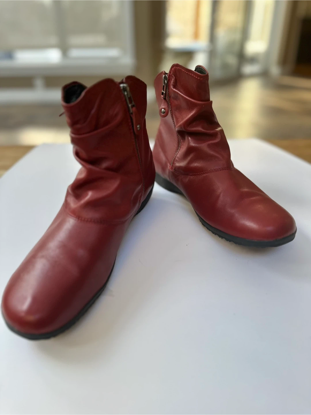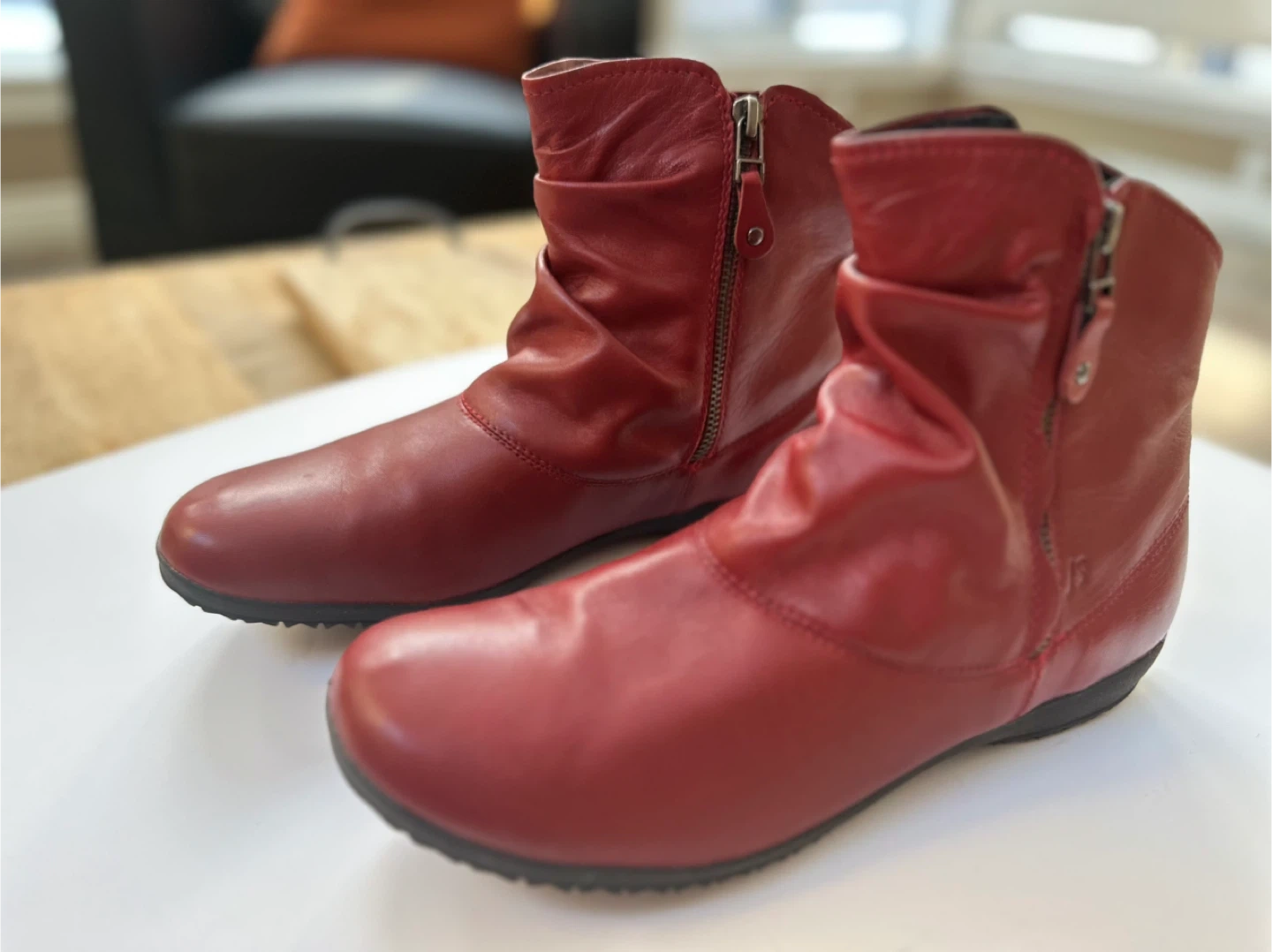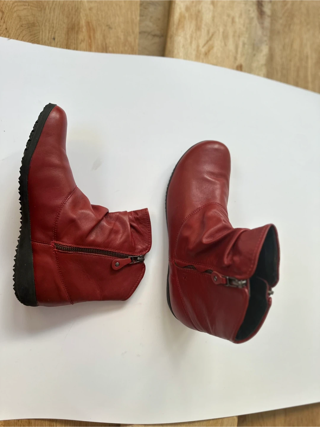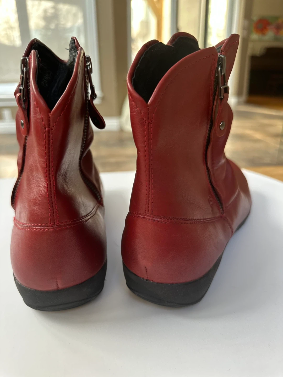 JOSEF SEIBEL ‘Naly 24’ red leather ankle boots with side zippers. These boots have a soft, flexible design and a low heel for all-day wear.