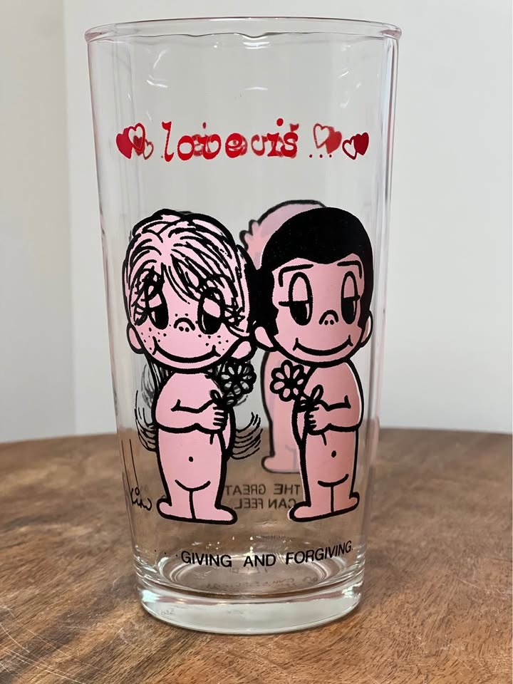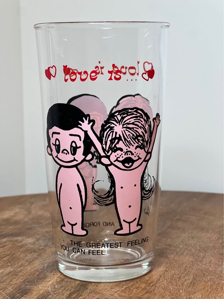 Here are two vintage drinking glasses featuring the popular "Love Is..." cartoon series by Kim Casali. These are collectible retro items from the mid-1970s, signed "Kim". Each glass is about 6 inches tall and shows a boy and girl in sweet poses with captions like "Togetherness" or "The greatest feeling you can feel". Preowned. Pickup is 58th and 7th Ave in midtown Manhattan.
