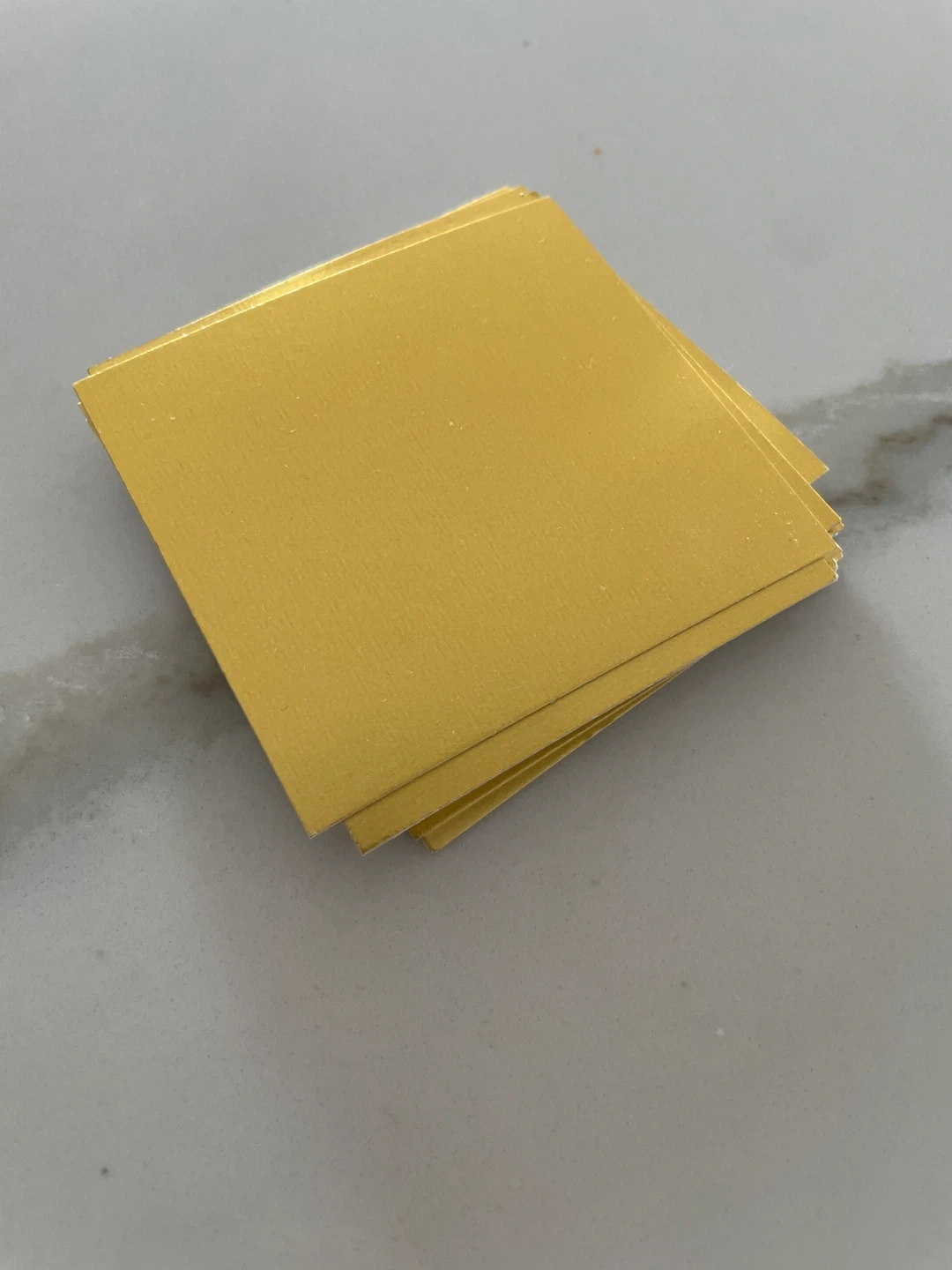 This is a stack of gold square cards. They're perfect for crafting or scrapbooking projects. The cards have a smooth, matte finish.