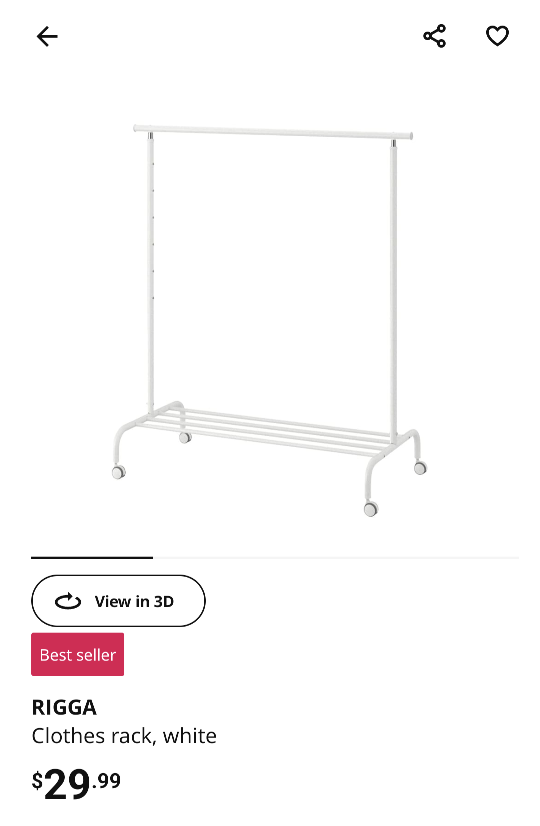 1 / 21 / 2Buy & SellIkea Rigga Clothing Rack WhiteIkea Rigga Clothing Rack White$10Don't need it anymore as I'm redoing my entire room! In perfect condition as bought! I don't have the box anymore.ConditionLike newWHERE TO MEETCheck LocationView MapSELLERverifiedRageLeslieville26623 reviews1 chats·1 favorites·32 viewsSEND CHAT TO SELLERHi Rage! I’m interested in your listing.Hi Rage! I’m interested in your listing.Get the Karrot app to chatSign In to chat