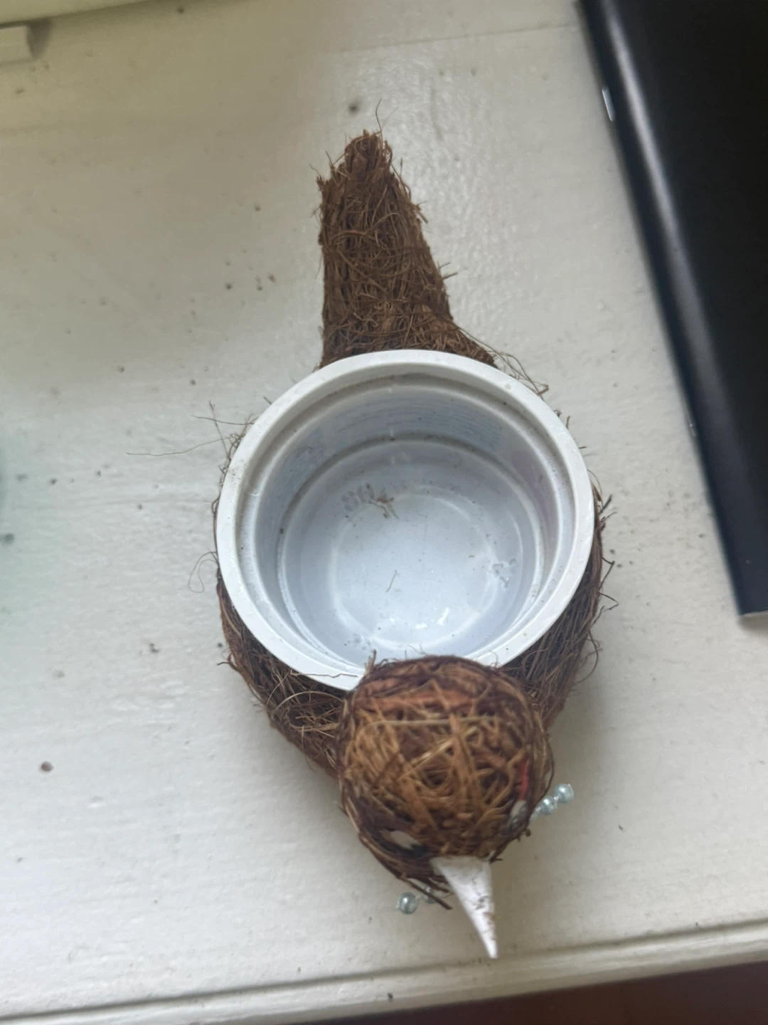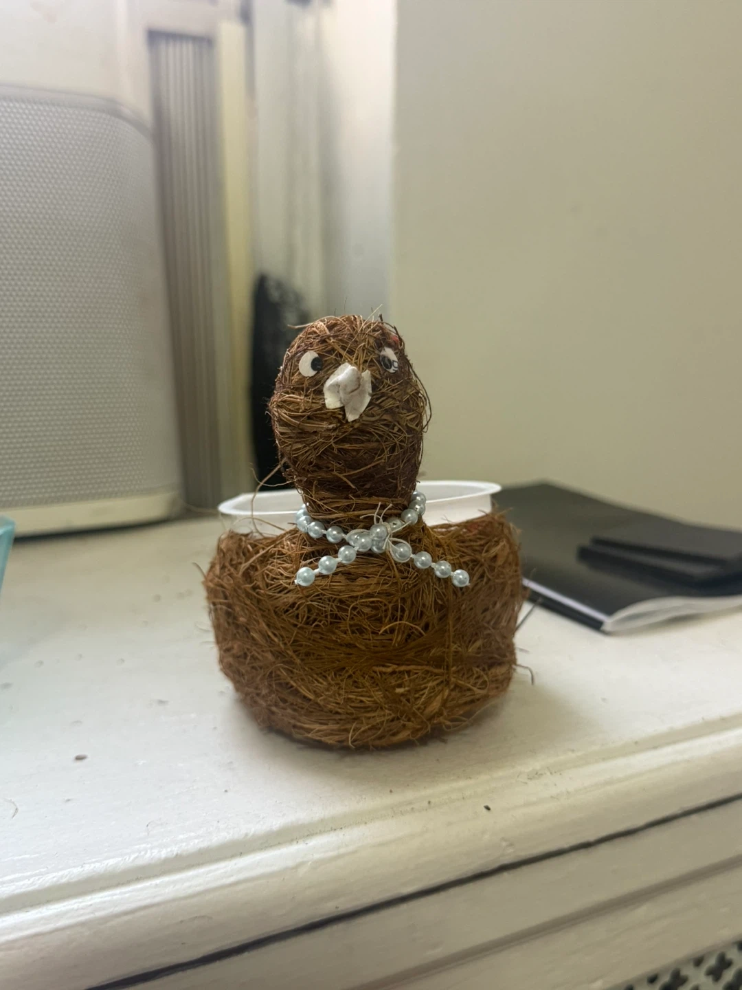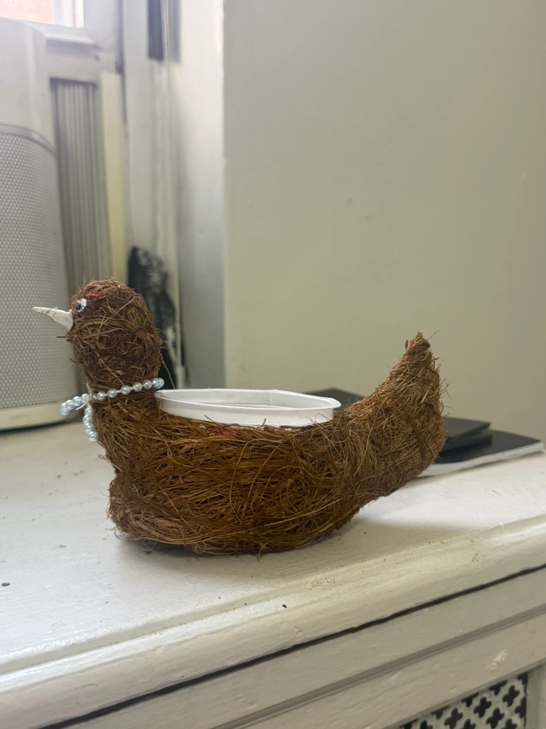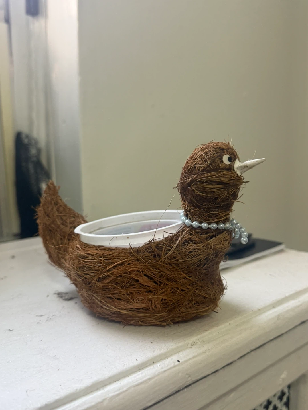 This adorable planter is shaped like a bird and made from natural coir material. It has a pearl necklace accent around its neck. The interior plastic cup is ready for your small plant!