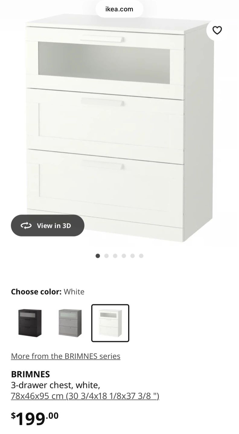 Buy & SellIKEA BRIMNES 3-drawer chest, whiteIKEA BRIMNES 3-drawer chest, white$120This is an IKEA BRIMNES 3-drawer chest in white. It measures 78x46x95 cm. Offers great storage! Selling due to moving to a new place.ConditionLike newWHERE TO MEETCheck LocationView MapSELLERverifiedBrianLougheed1004 reviews0 chats·0 favorites·33 viewsSEND CHAT TO SELLERHi Brian! I’m interested in your listing.Hi Brian! I’m interested in your listing.Get the Karrot app to chatSign In to chat
