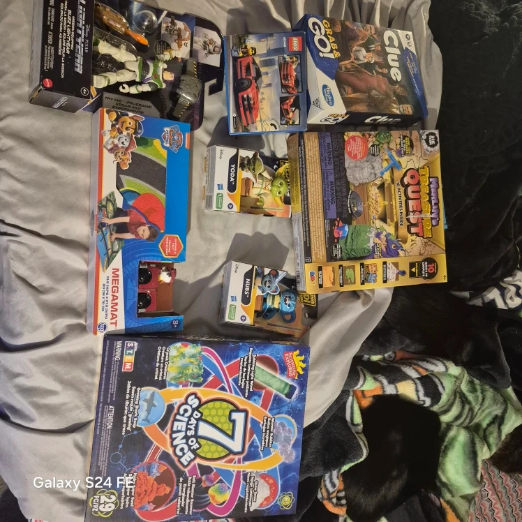 Bundle of kids' toys including a Buzz Lightyear action figure, a LEGO car set, and a Paw Patrol Megamat. Also includes a '7 Days of Science' STEM kit, a 'Merlin's Quest' excavation kit, a Yoda figurine, and a Clue Grab & Go game. Contents are as pictured. All new